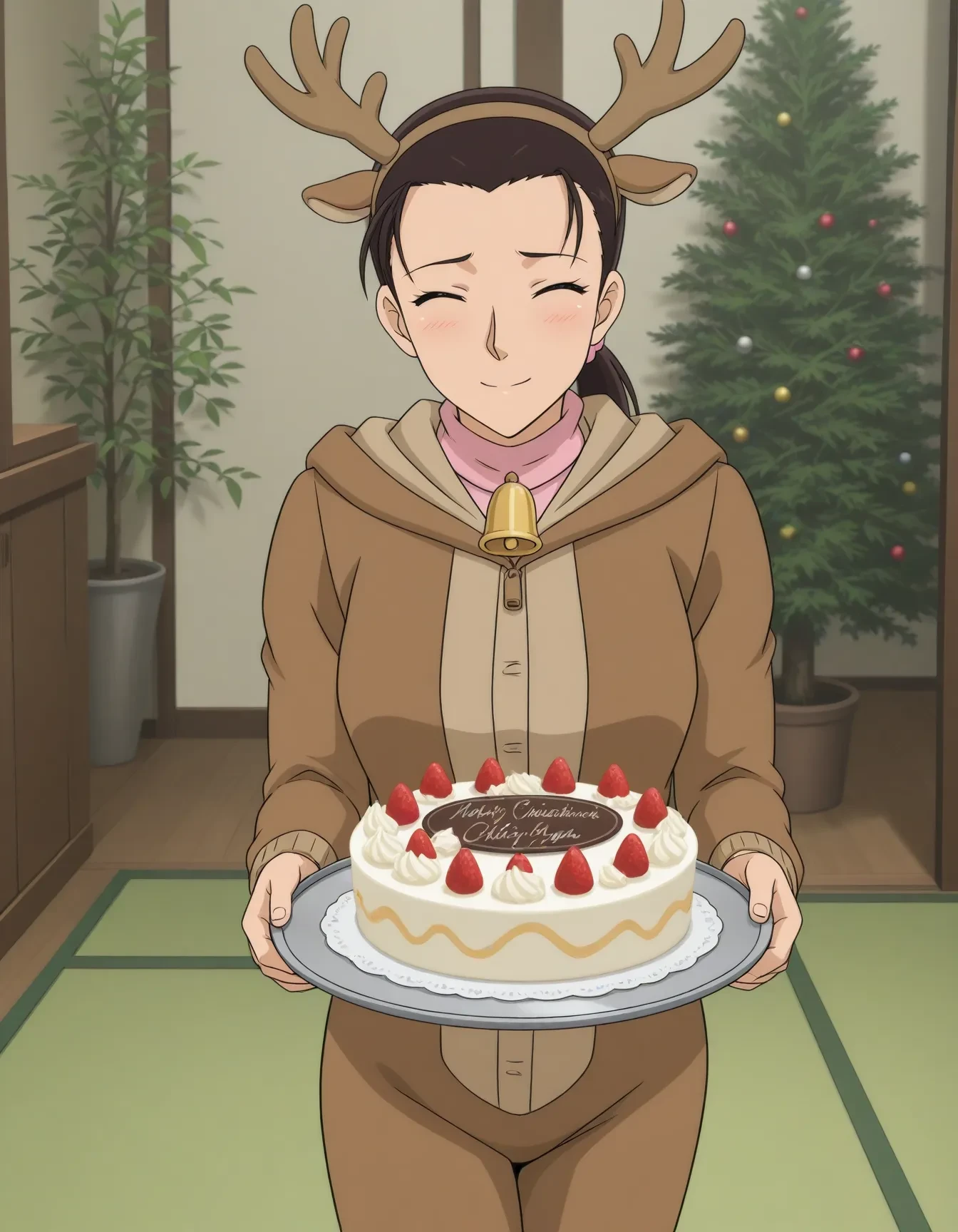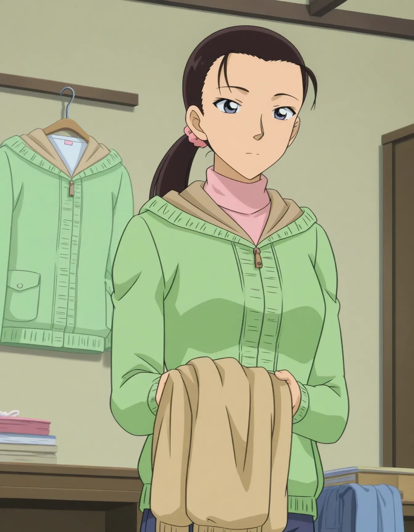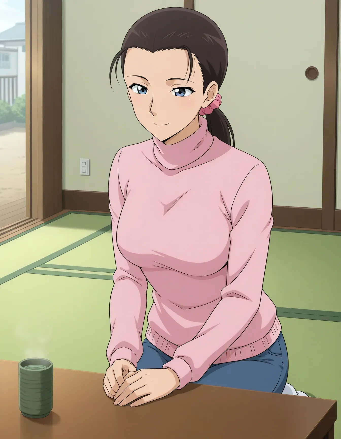 ishikawa shigeko,black hair,low ponytail,hair slicked back,forehead,mature female,