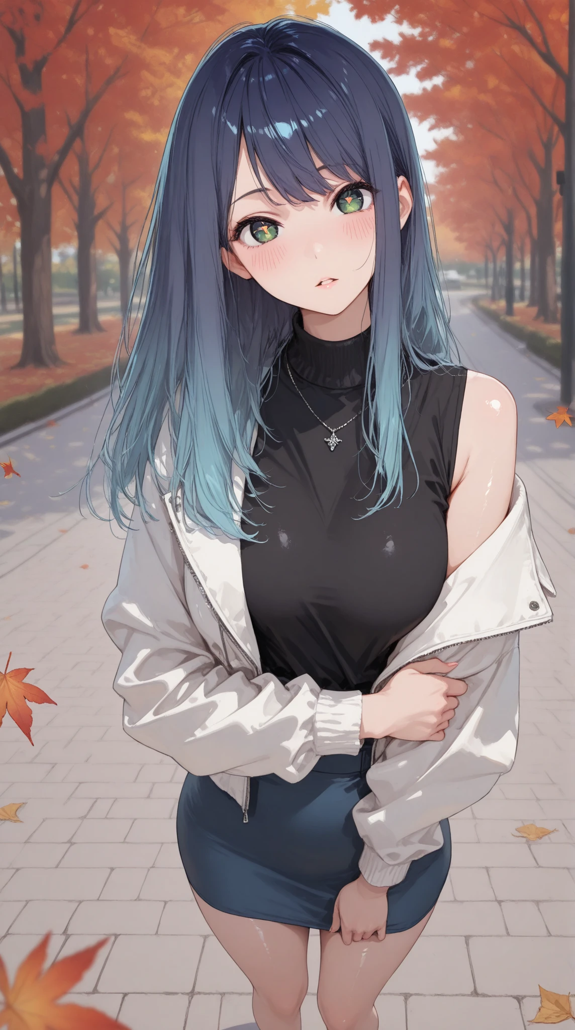 black_shirt, sleeveless_shirt, blue_skirt, off_shoulder, necklace, long_sleeves_jacket, white_jacket, turtleneck shirt