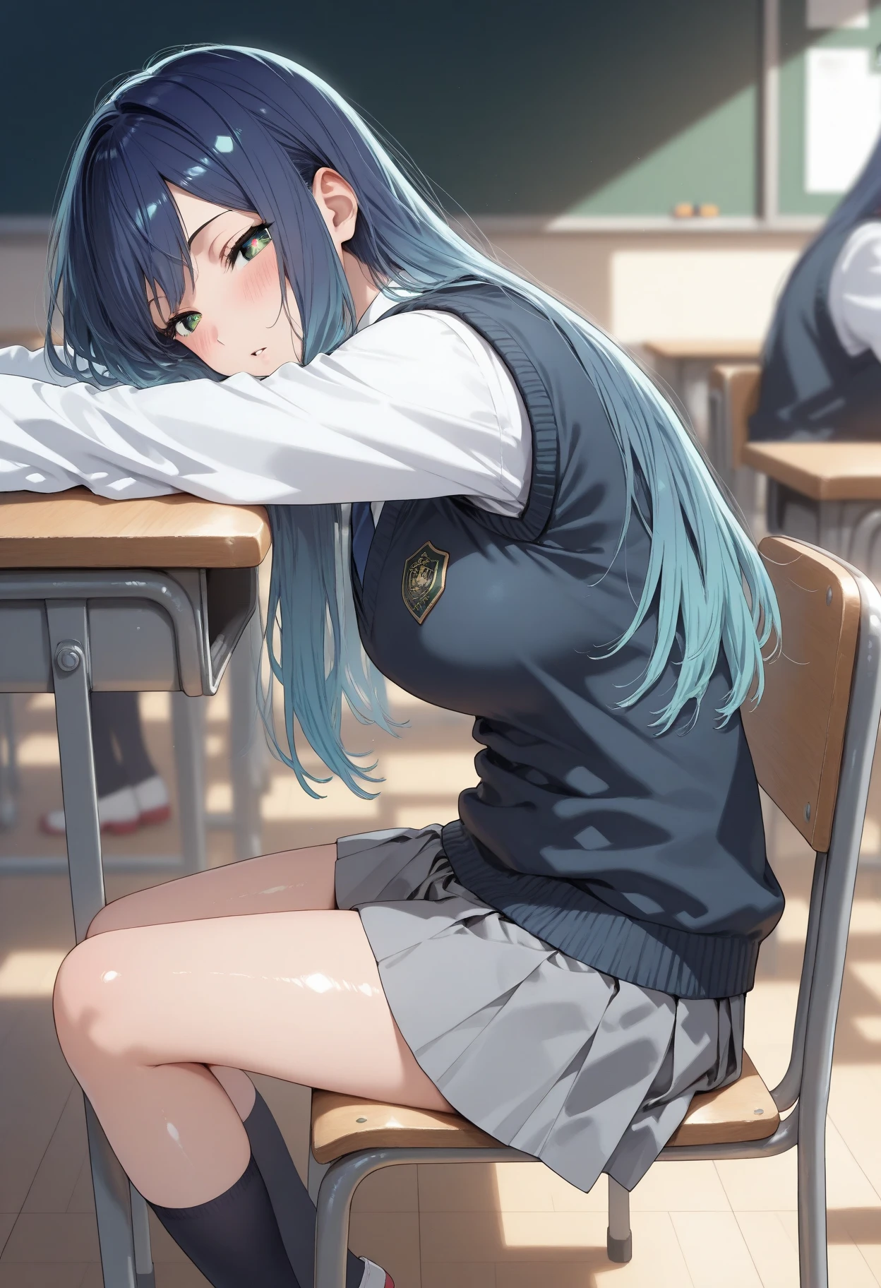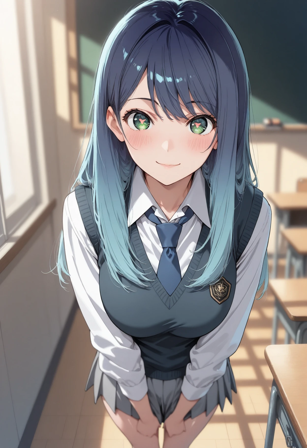 school_uniform, white_shirt, long_sleeves, collared_shirt, sweater_vest, blue_necktie, grey_skirt, pleated_skirt