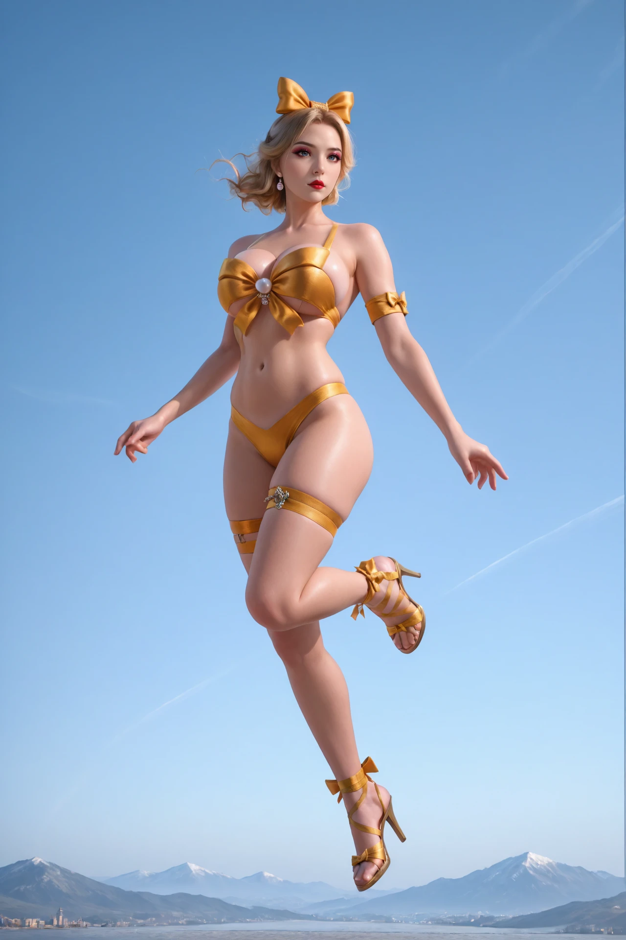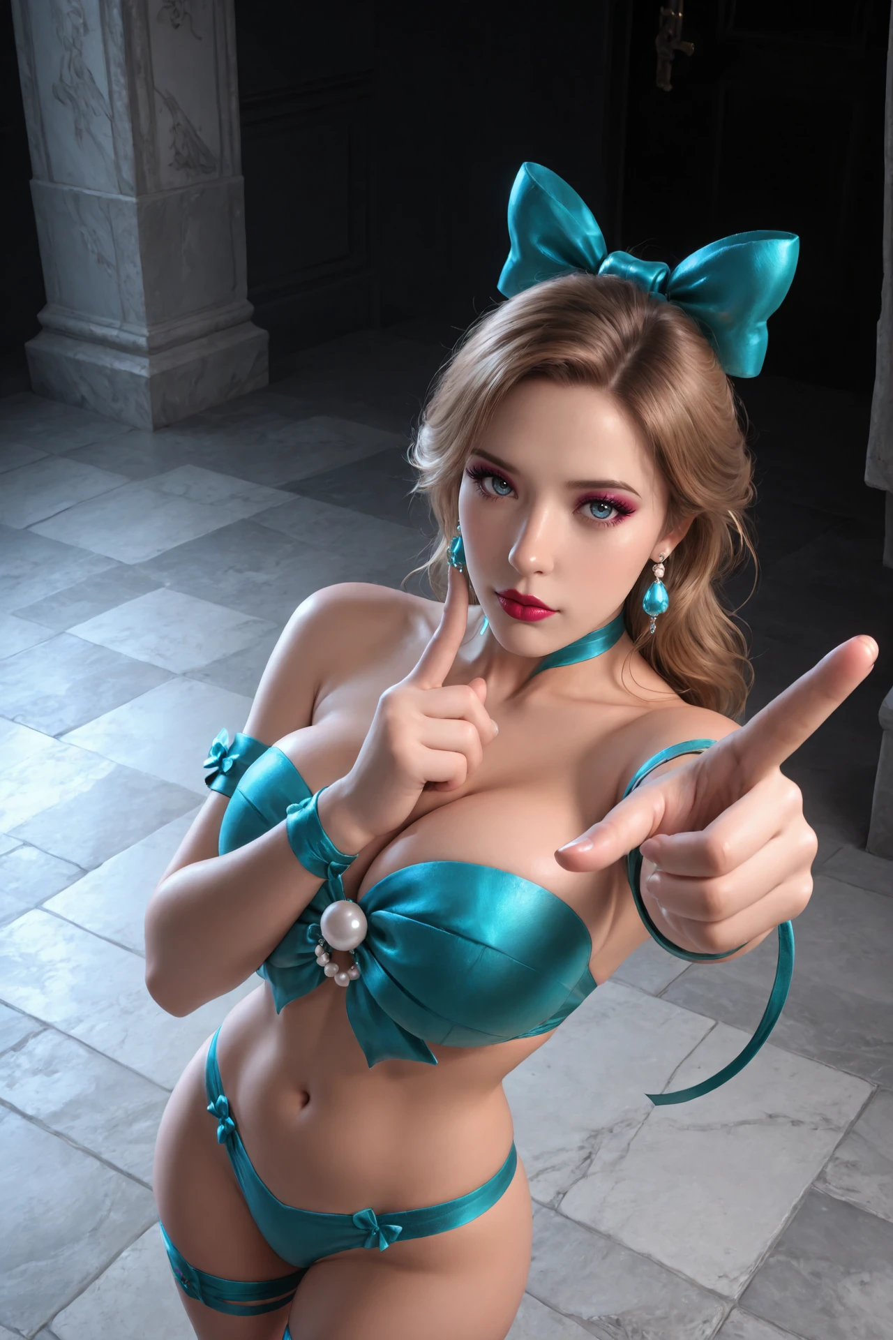 hair_bow,bow,ribbon,pearl,jewelry,earrings, naked_ribbon underwear,armband,thigh_strap,cross-laced high_heels, huge_breasts,navel,
