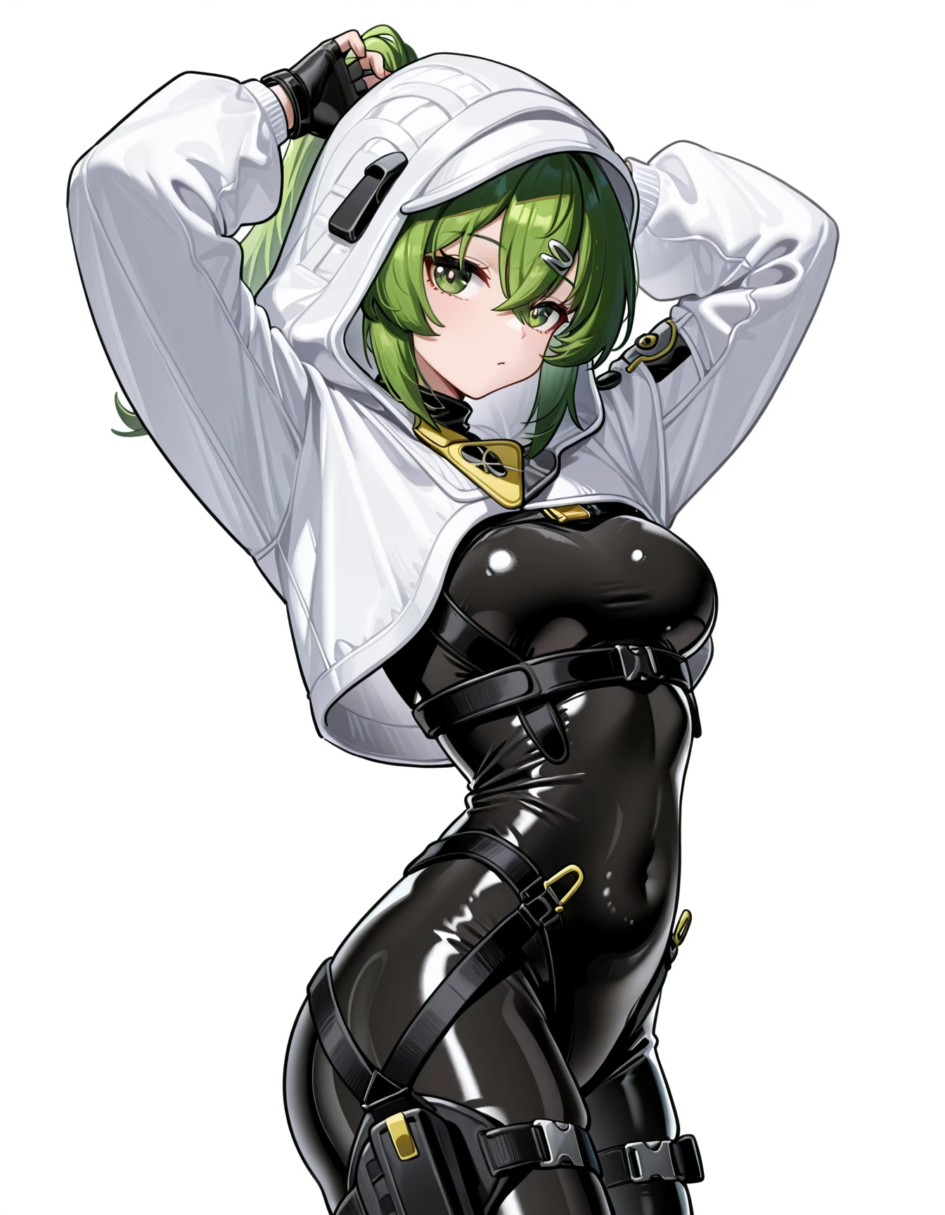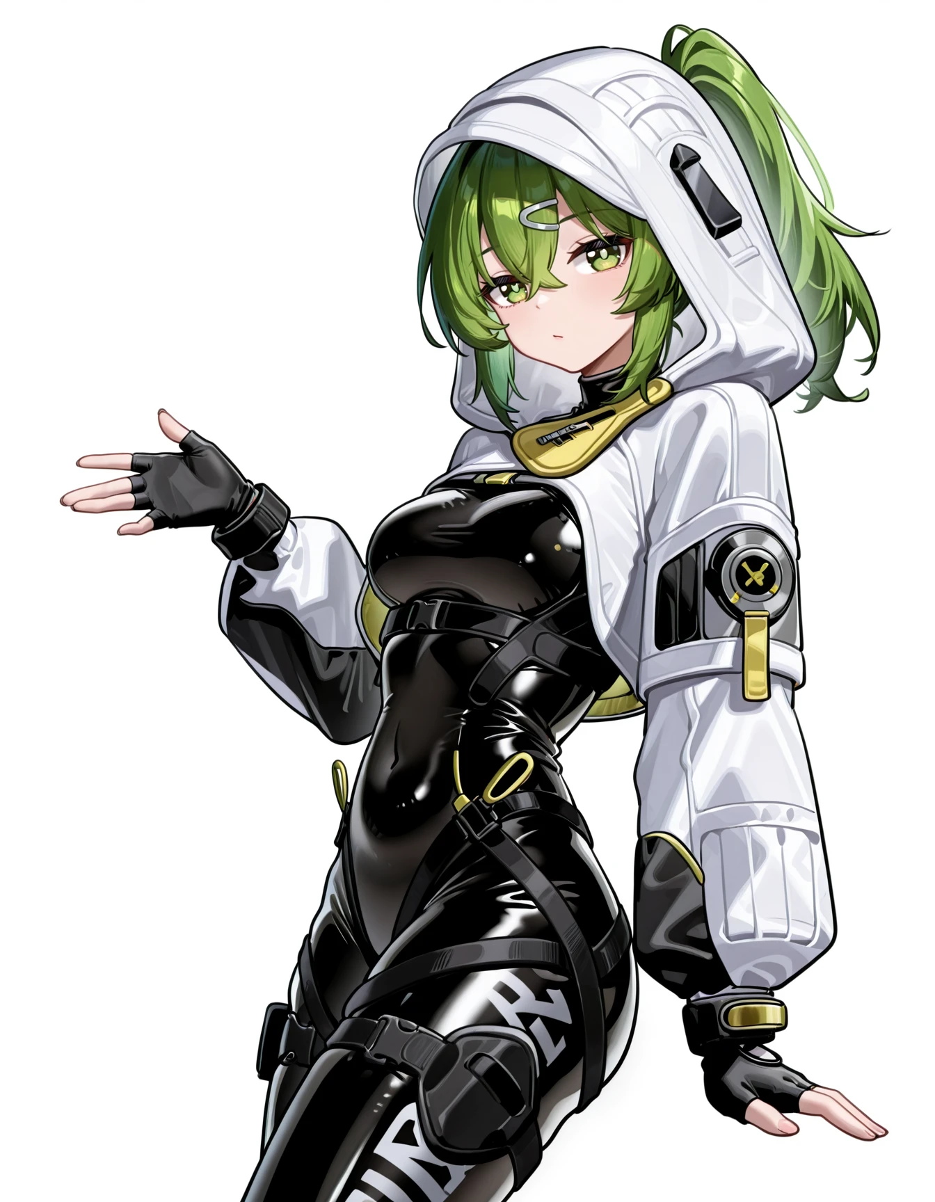 black gloves, fingerless gloves, thigh strap, covered navel, hooded jacket, hood up, skin tight, black ????????, white jacket