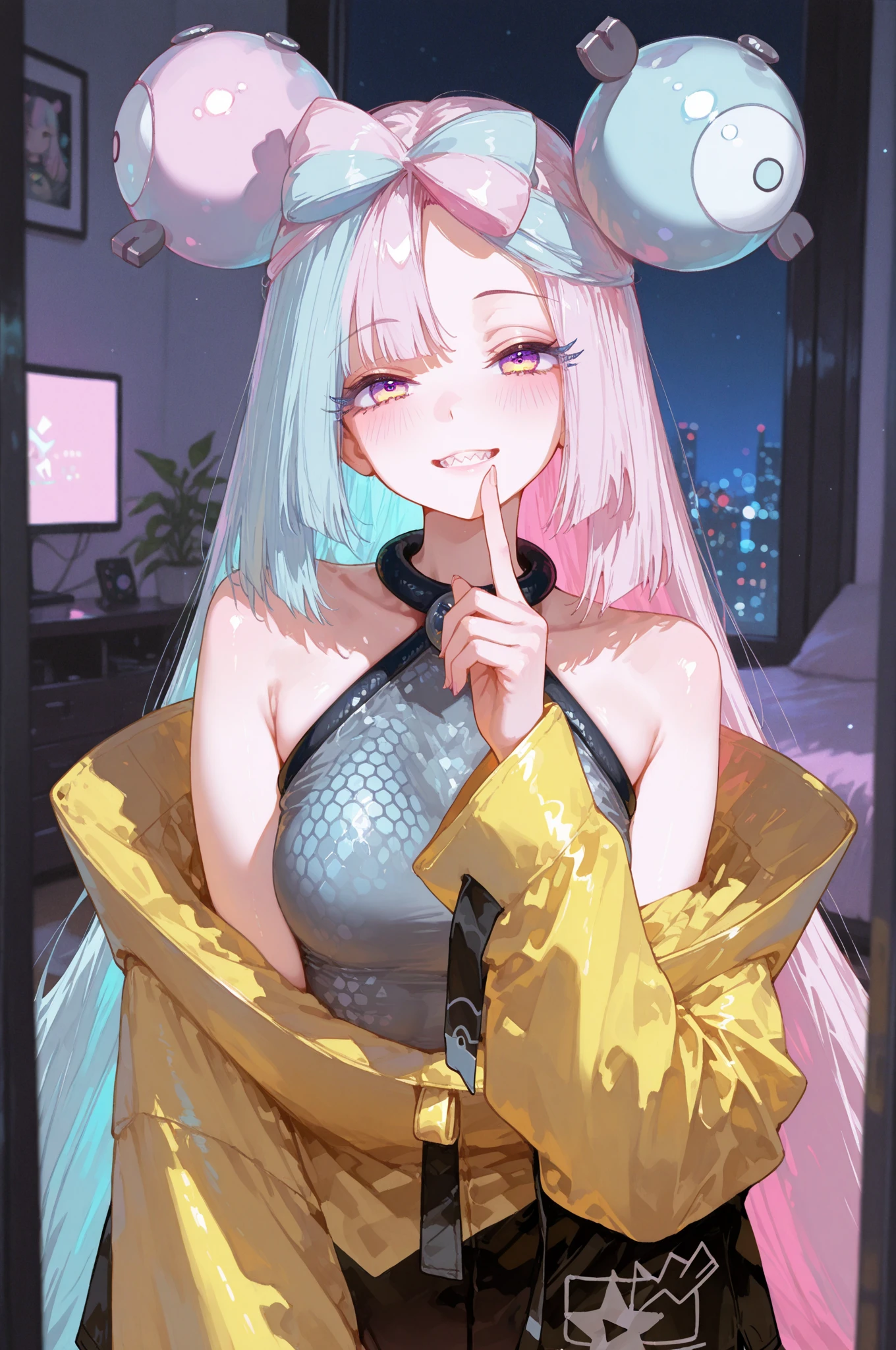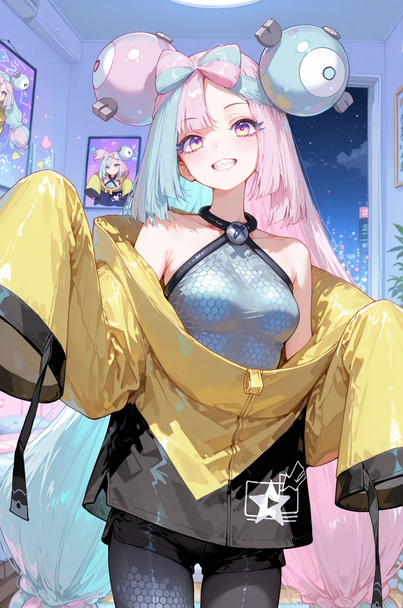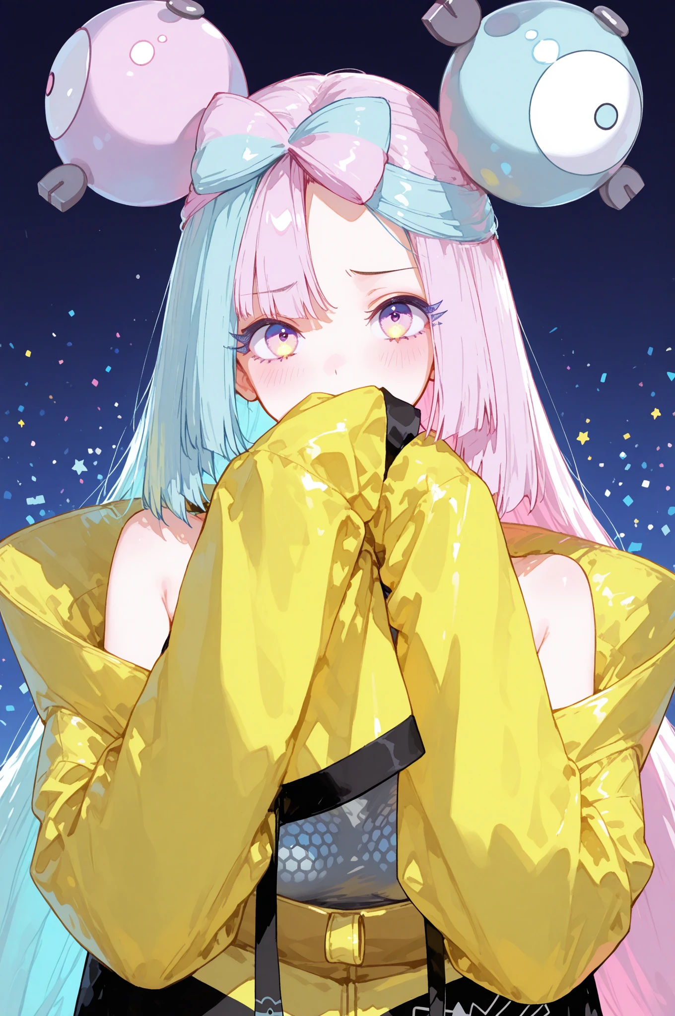 iono, long_hair, multicolored_hair, split-color_hair, bangs, blue_hair, pink_hair, bow-shaped_hair, pink_eyes
