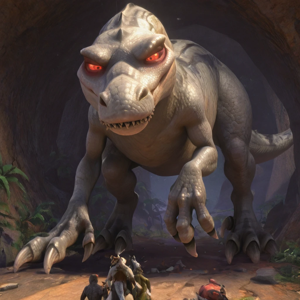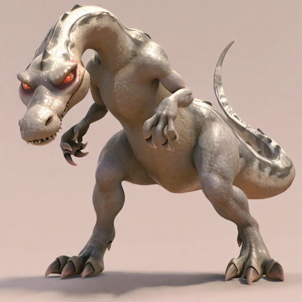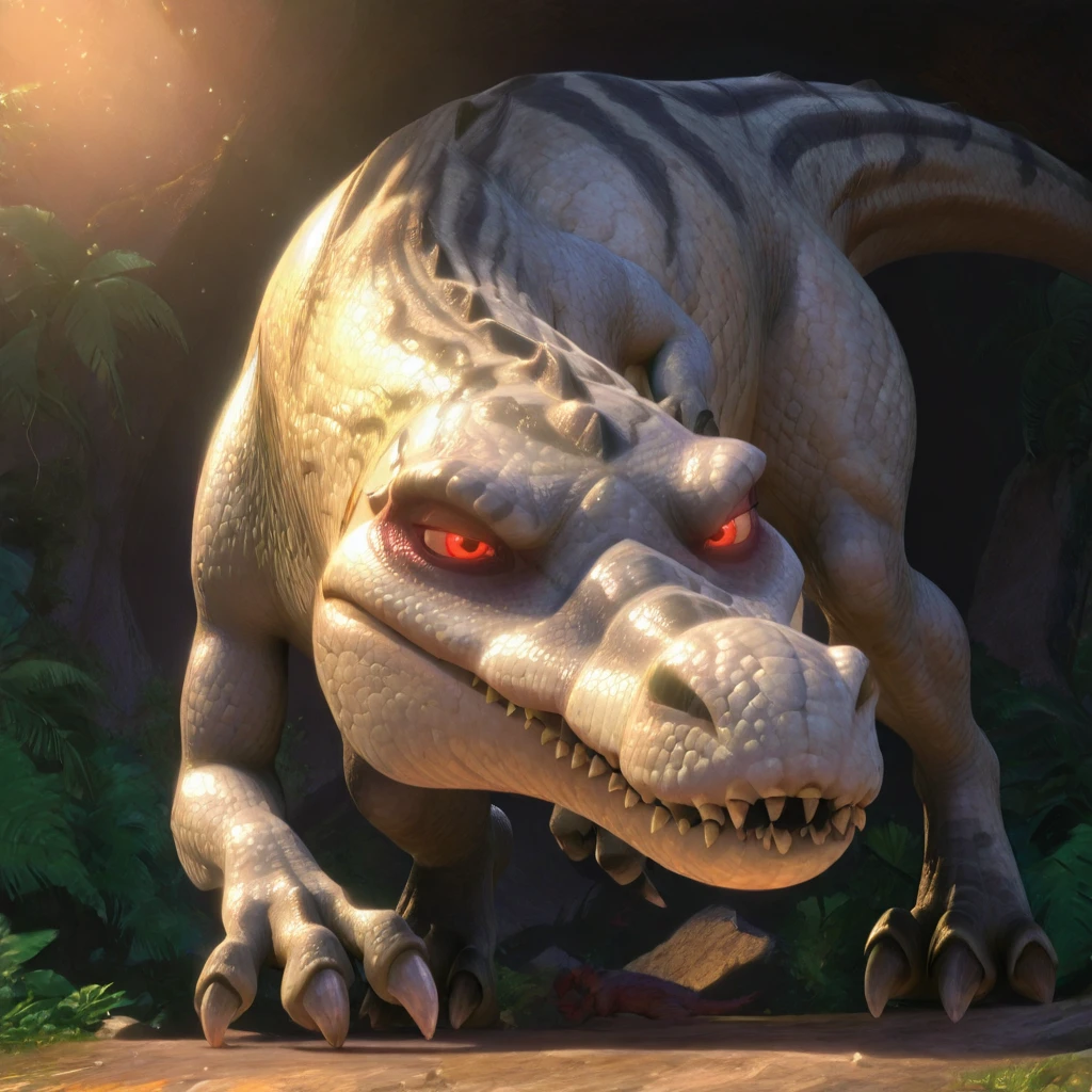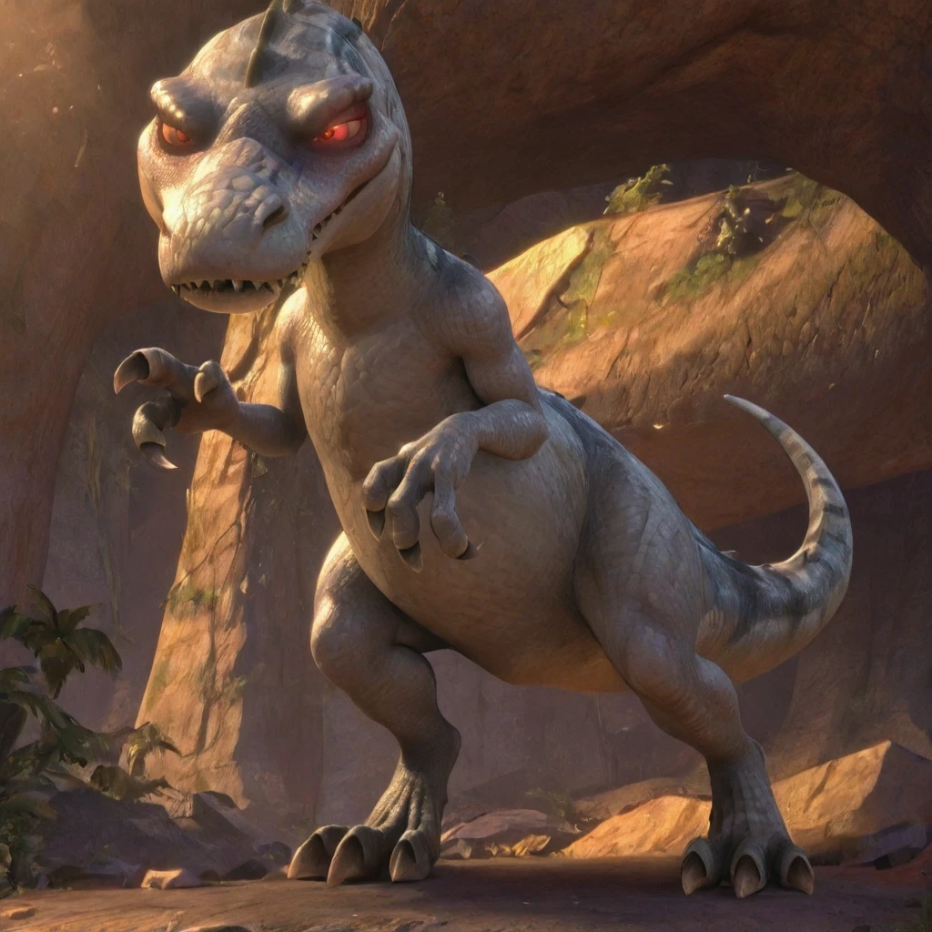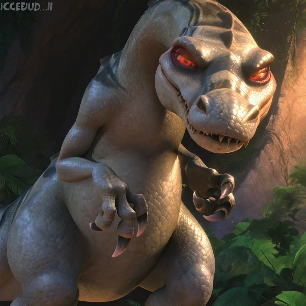 iceagerudy_il, grey skin, dinosaur, red eyes, sharp teeth, monster, alligator, claws, animal hands, animal feet, giant, solo