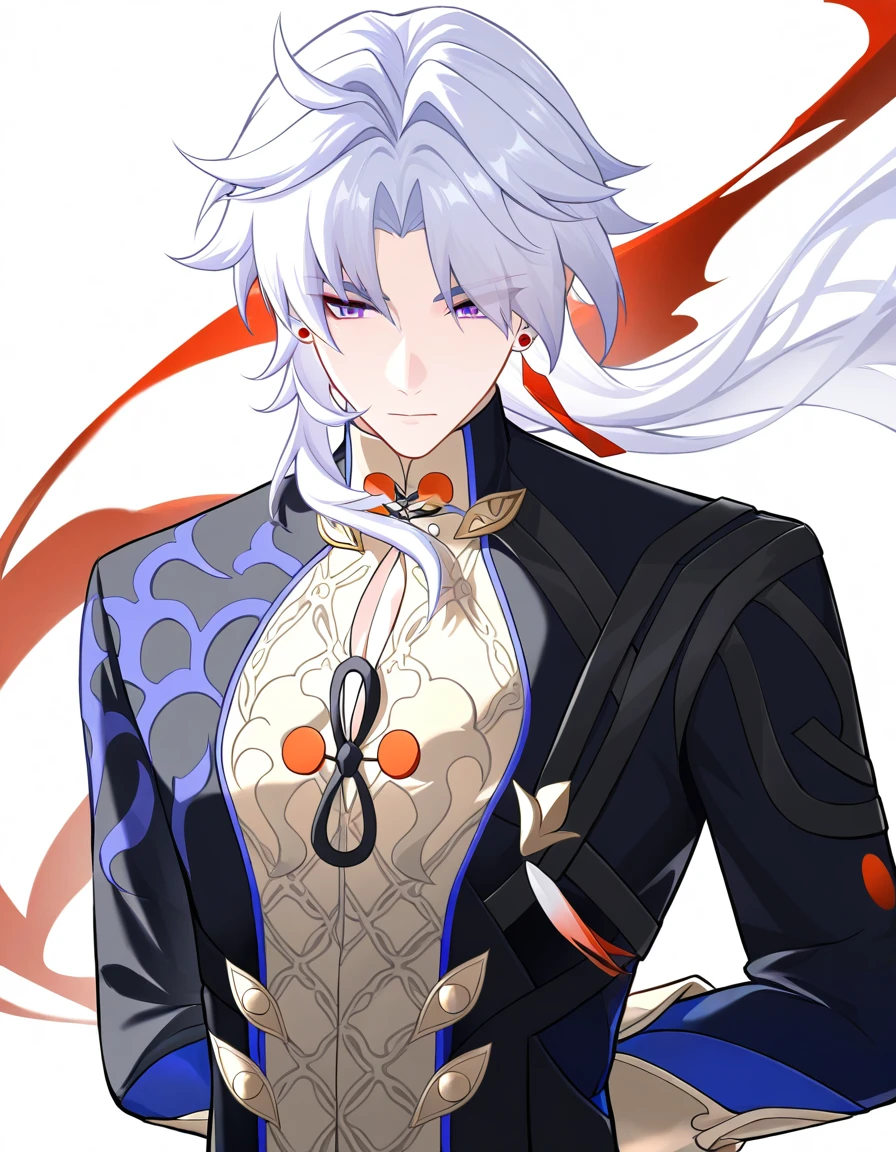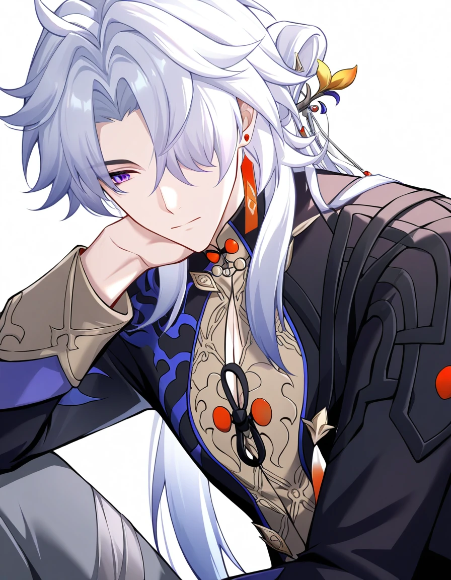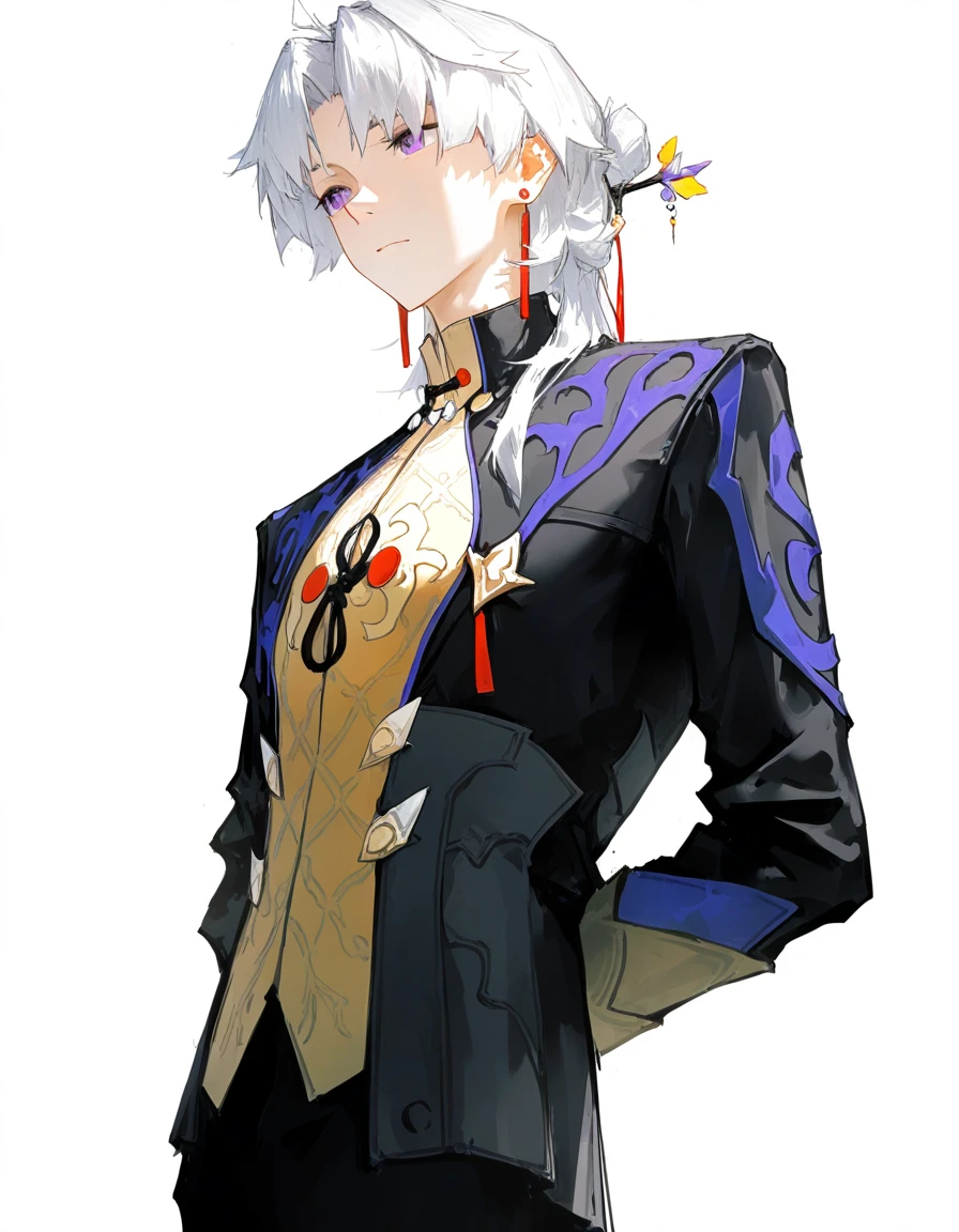 jewelry,earrings,white hair,purple eyes,long sleeves,parted bangs,jacket,