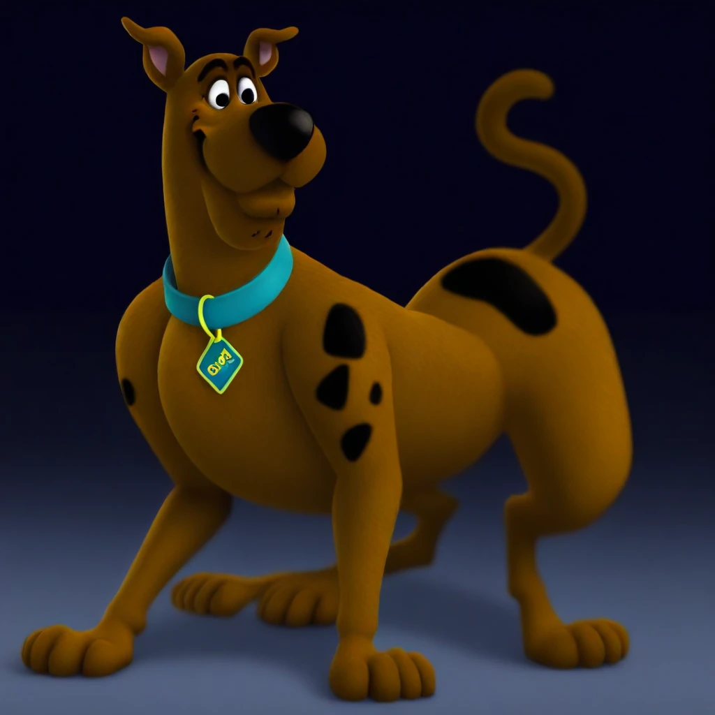 Scooby Doo, dog, feral, Great Dane, brown fur, black nose, black spots, black eyes, blue collar, dog tag