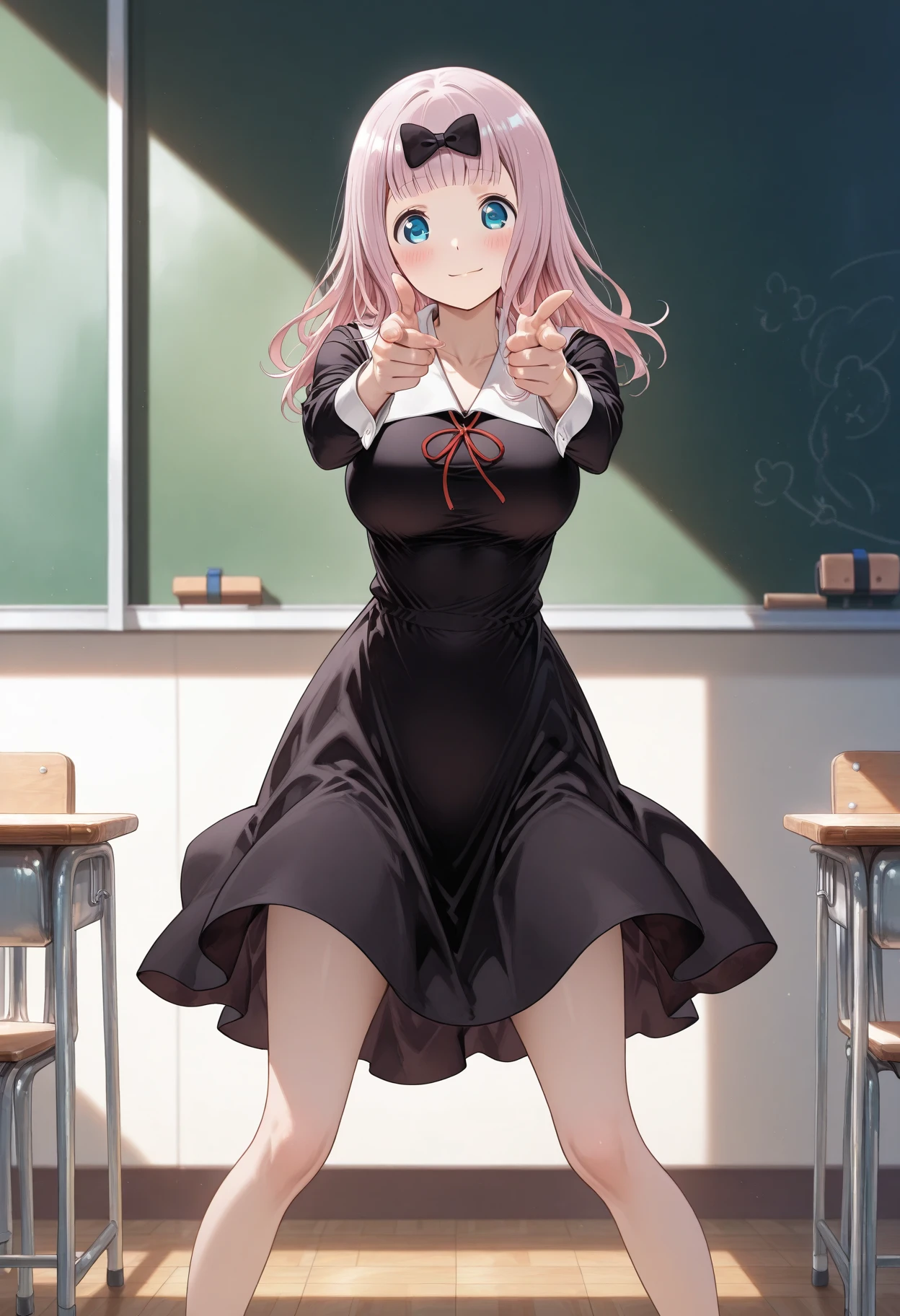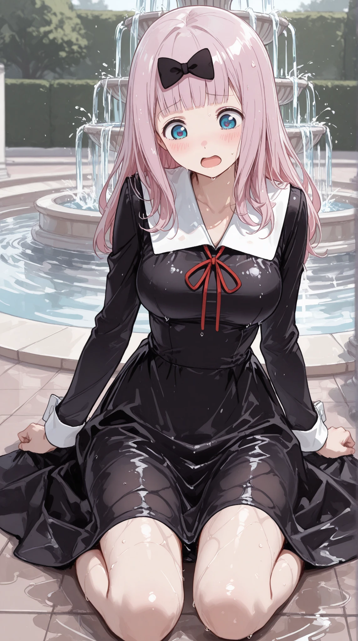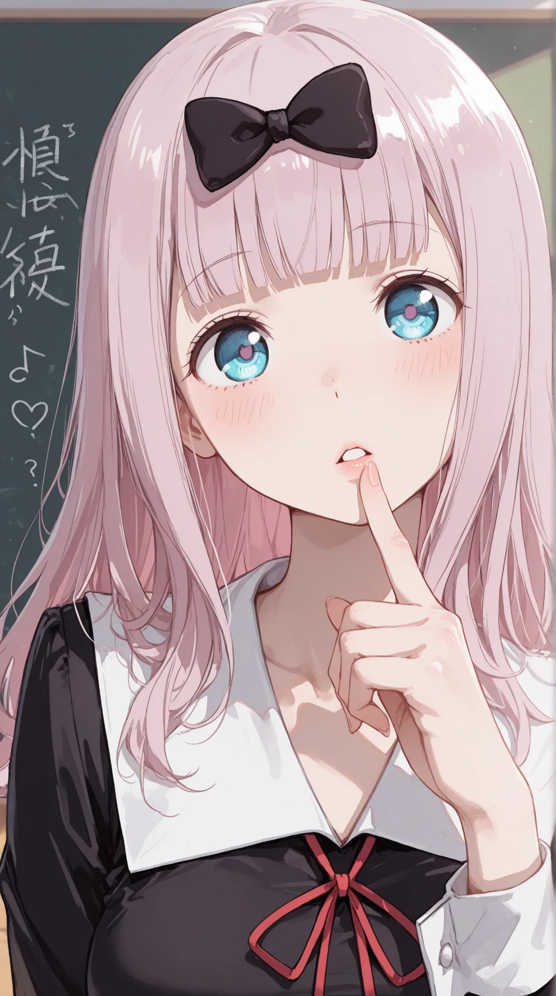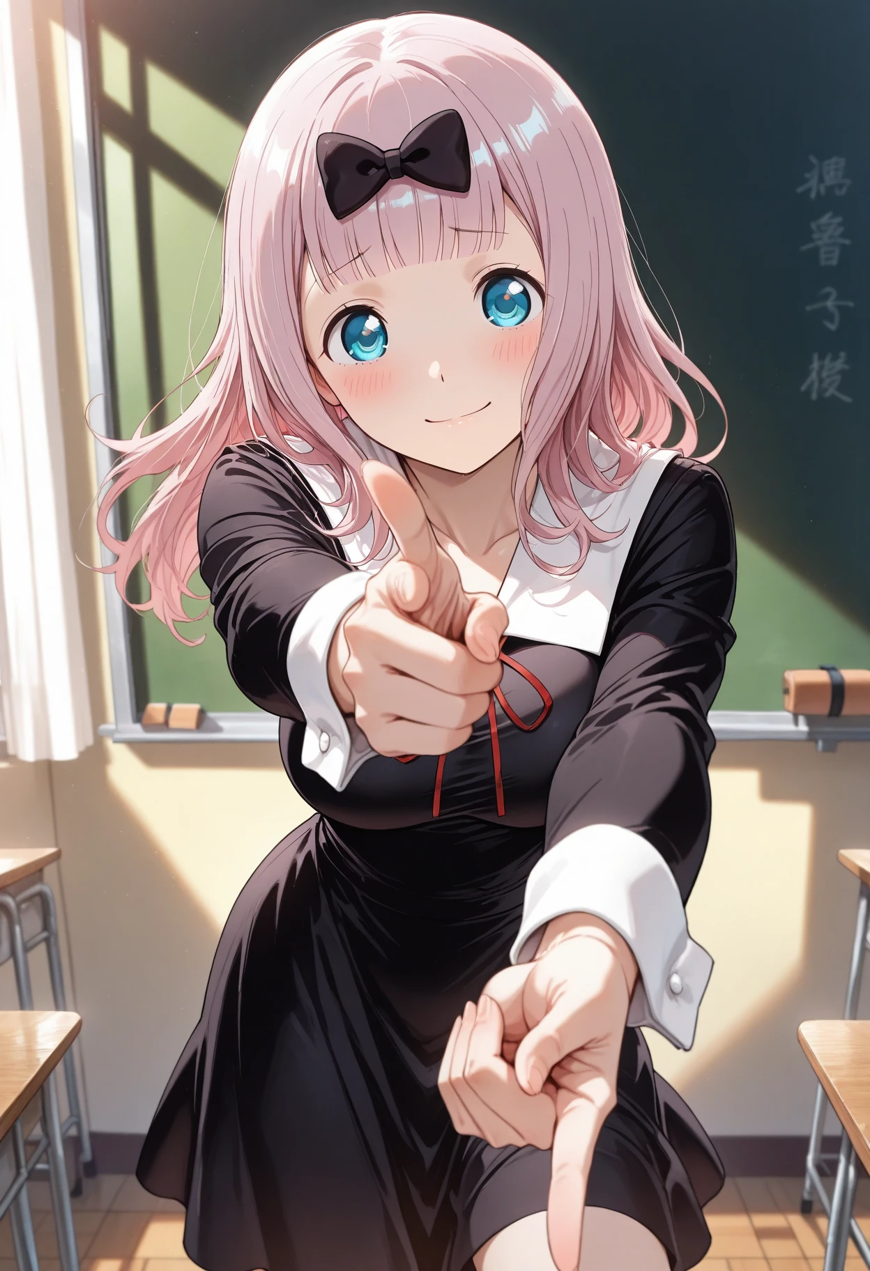 fujiwara_chika, long_hair, blunt_bangs, pink_hair, hair_bow, black_bow, blue_eyes