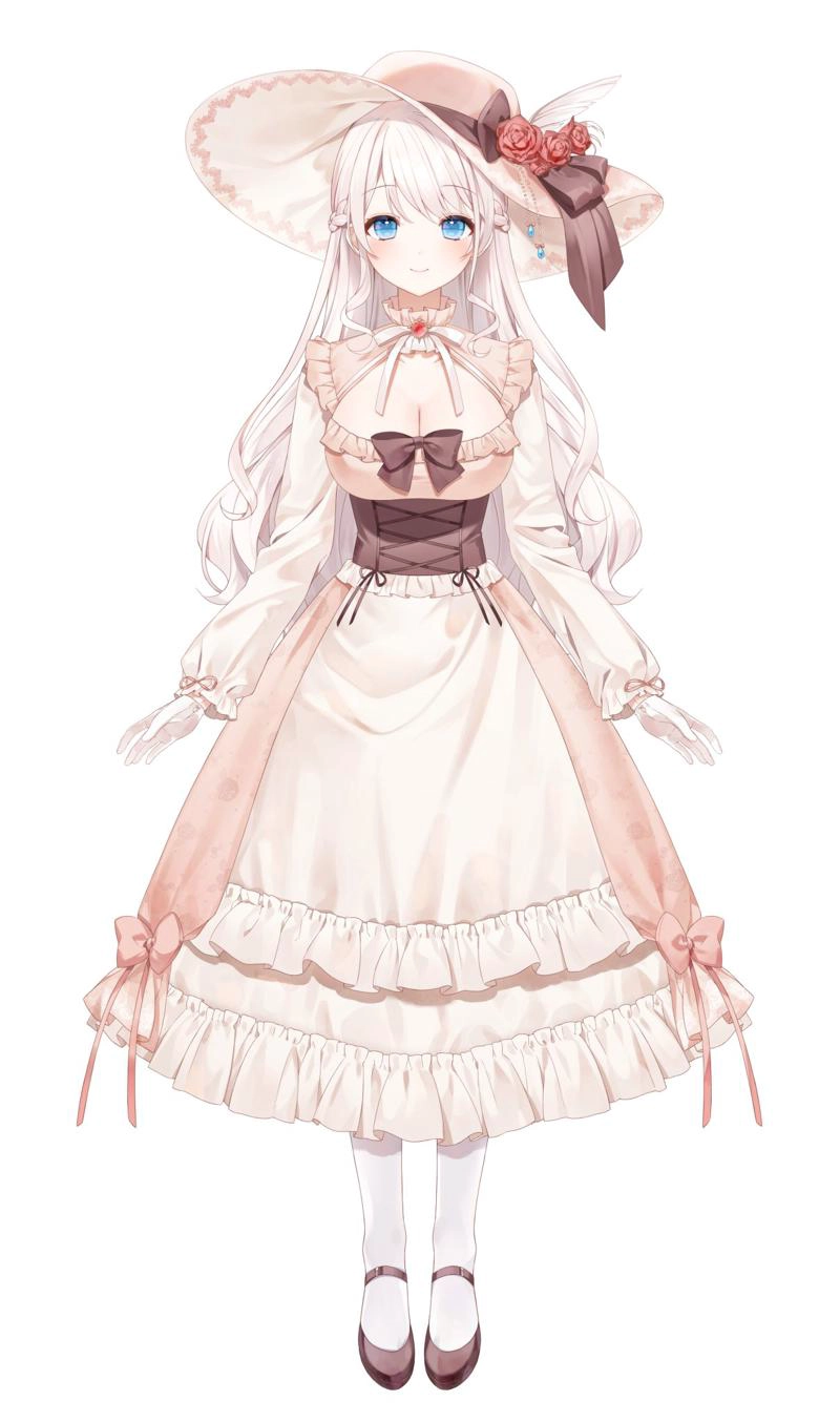 Yumeoto Chano features a refined, vintage aesthetic. Her look is centered around a "Tea Party" or "Cottagecore" theme, characterized by her wide-brimmed sun hat, corseted dress, and elegant white-and-brown color palette.