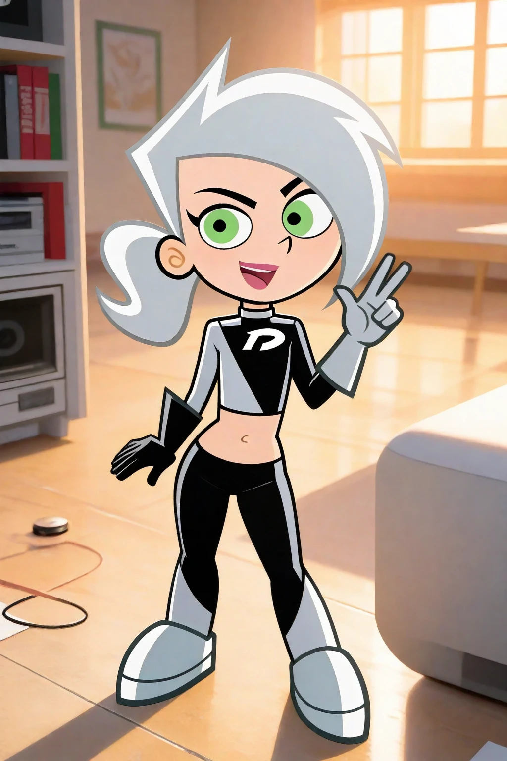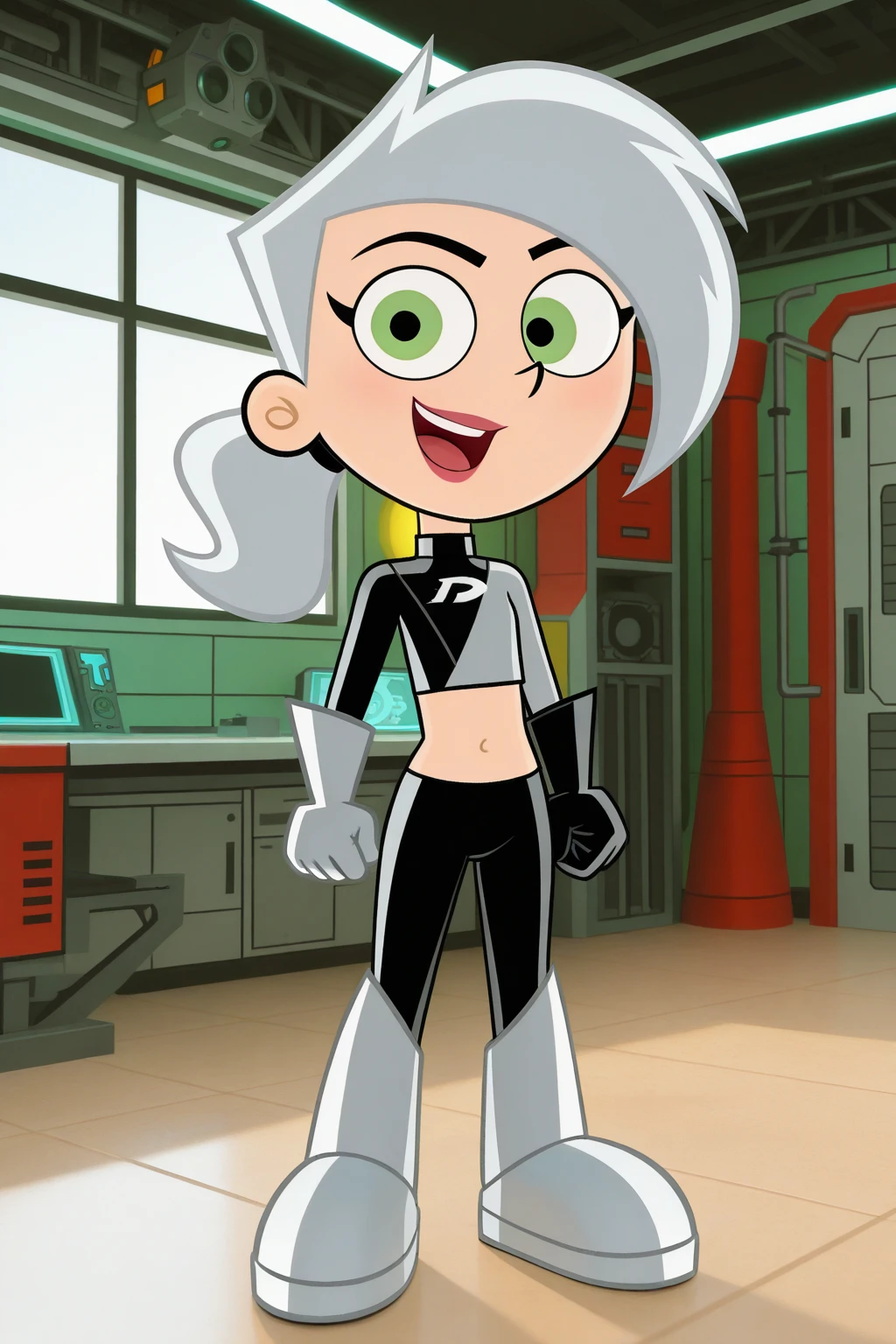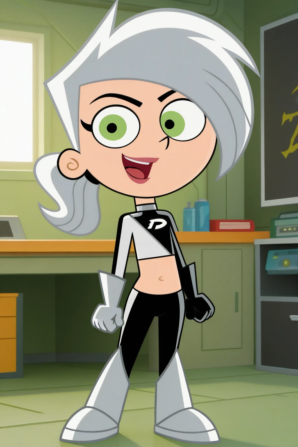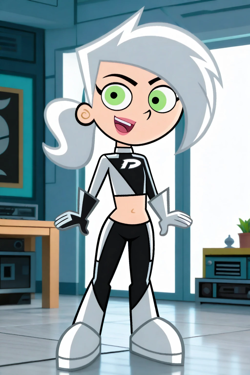 1girl, 3d, toon style, chibi, full body, solo, masterpiece, highly detailed, exquisite detail, high definition, best quality, ultra highres, DaniPhantomG, fair skin, green eyes, silver hair, silver spiky hair, hair tie, high ponytail, two-piece outfit, crop top, pantashoes, asymmetrical pattern, black right glove, white left glove, silver boots, lips, cute, happy face