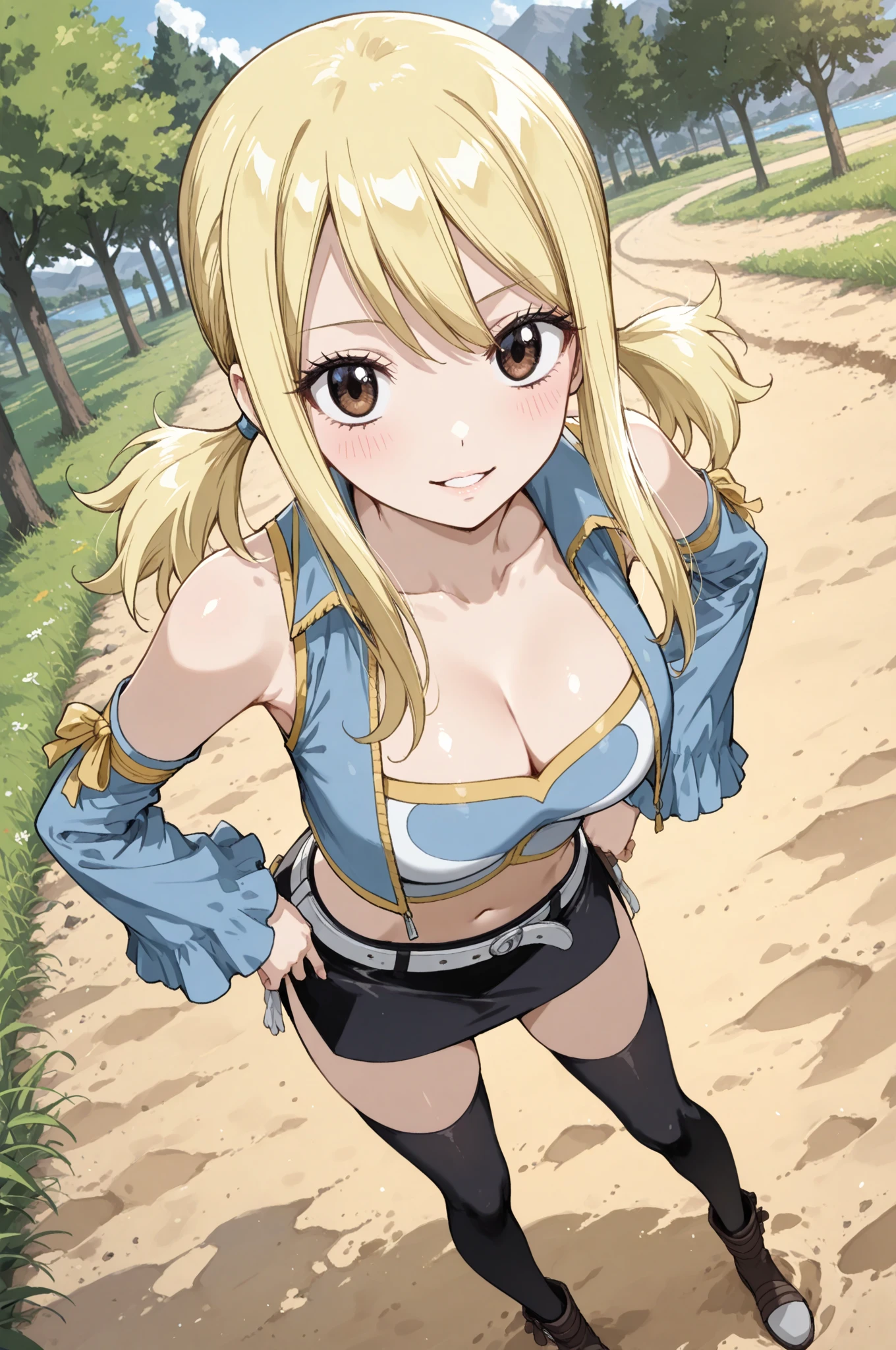 one_side_up, blue_ribbon, sleeveless, white_shirt, zipper, zettai_ryoukki, blue_skirt, brown_belt, black_thighighs, brown_footwear
