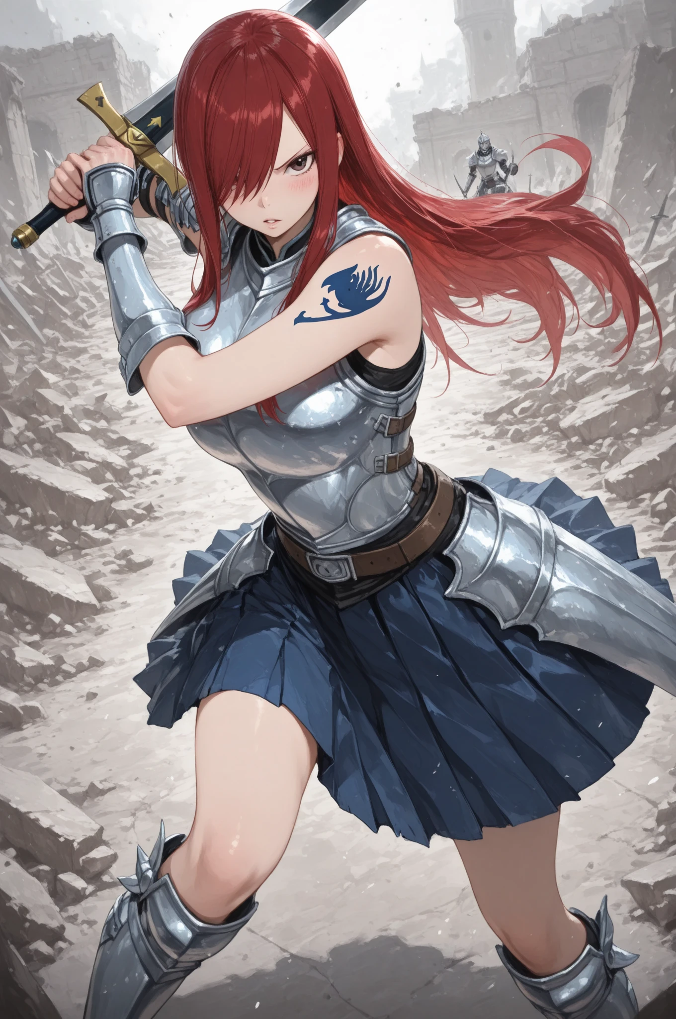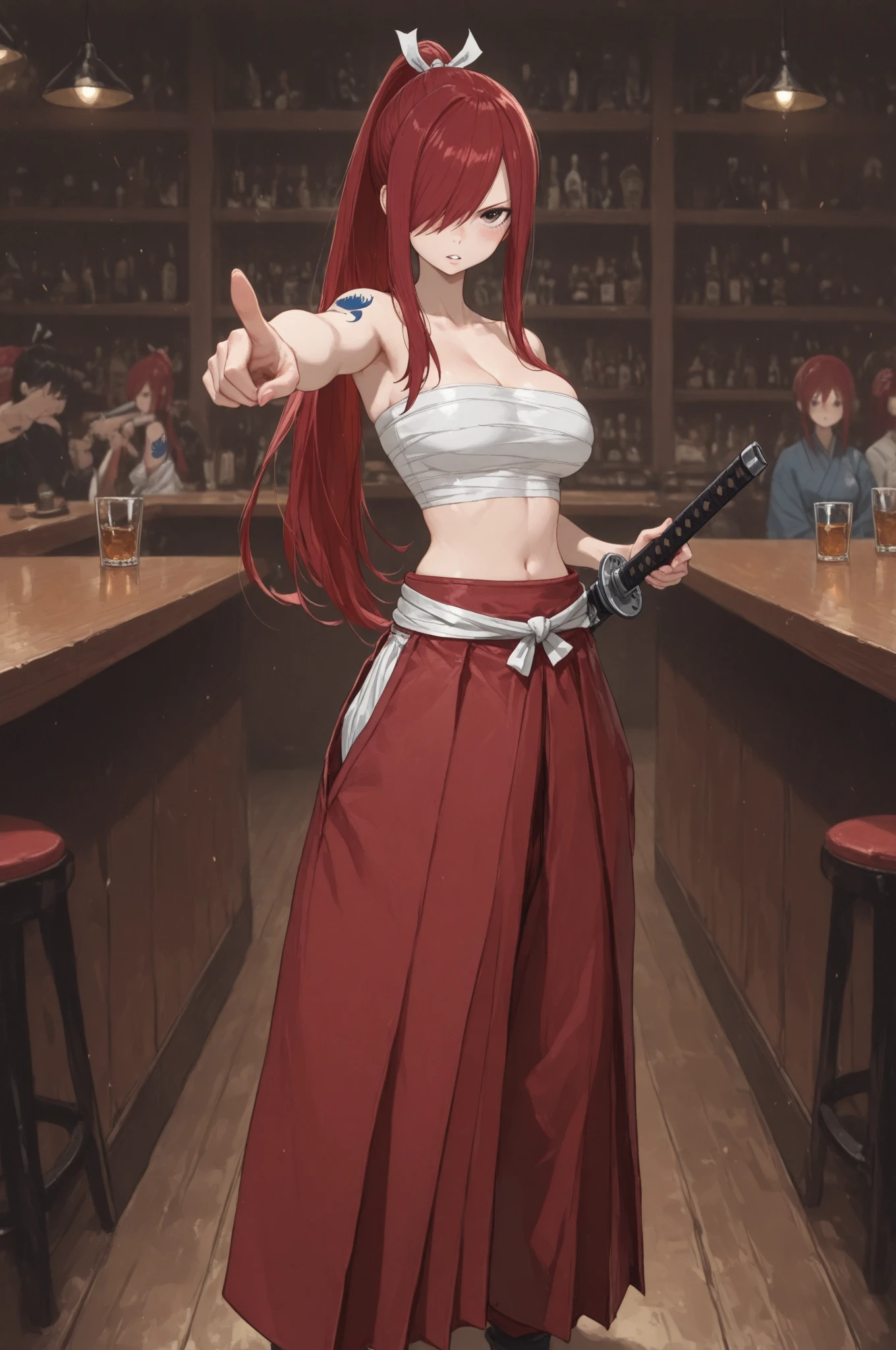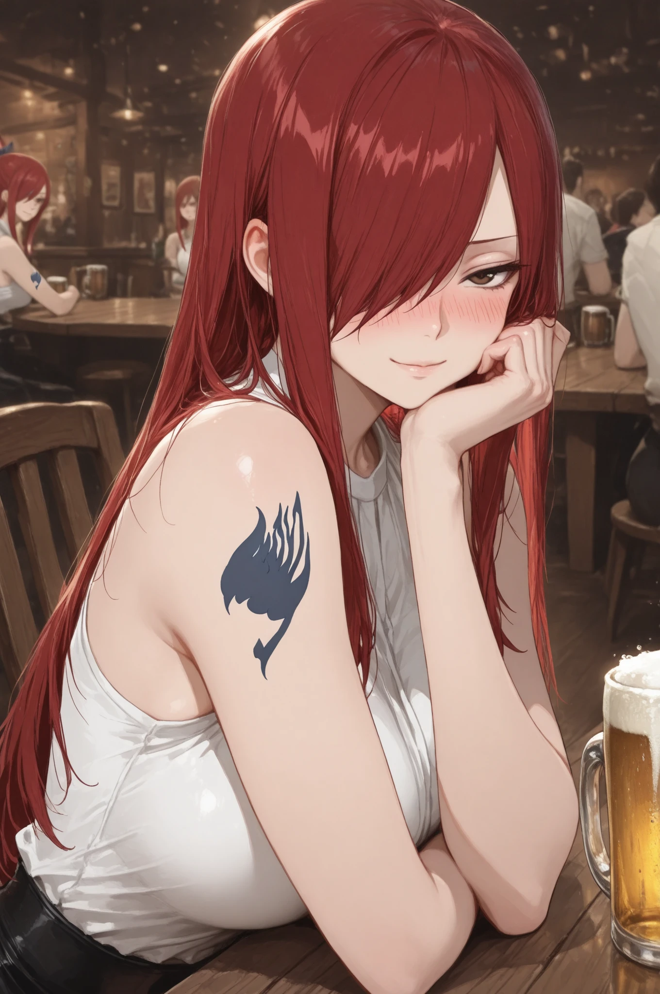 erza_scarlet, long_hair, hair_over_one_eye, red_hair, brown_eyes, arm_tattoo