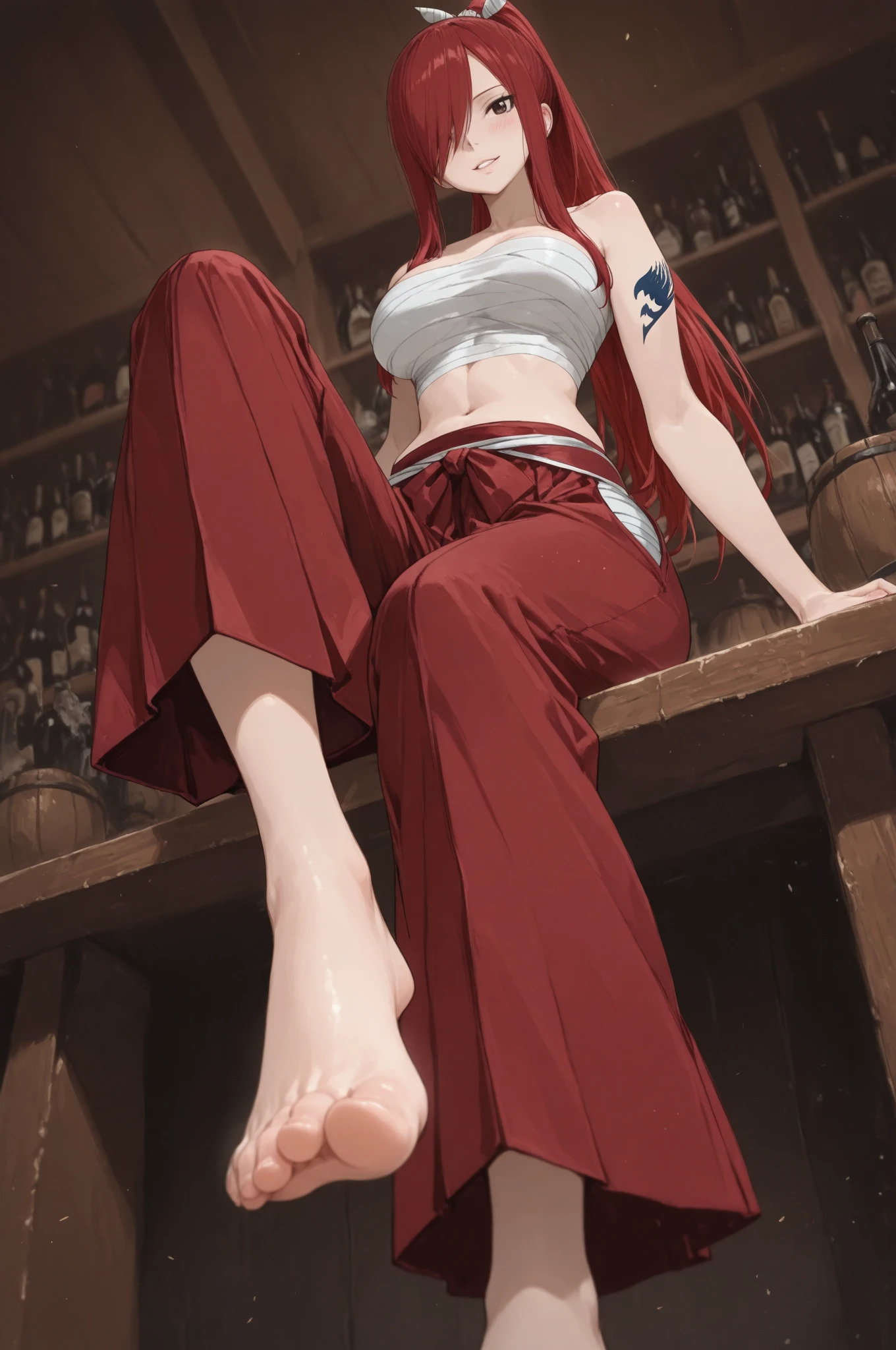 _sarashi, ponytail, hair_ribbon, japanese_clothes, midriff, hakama, red_pants, long_pants, _feet