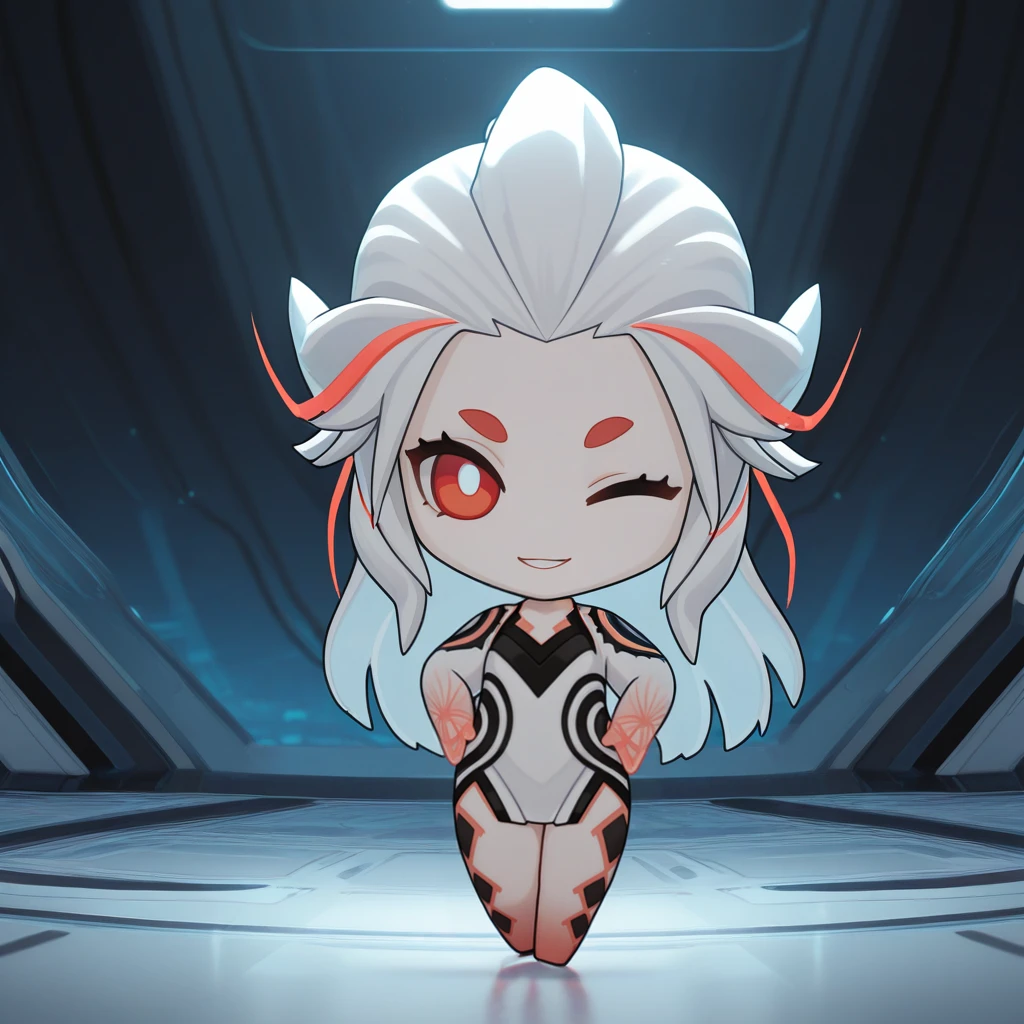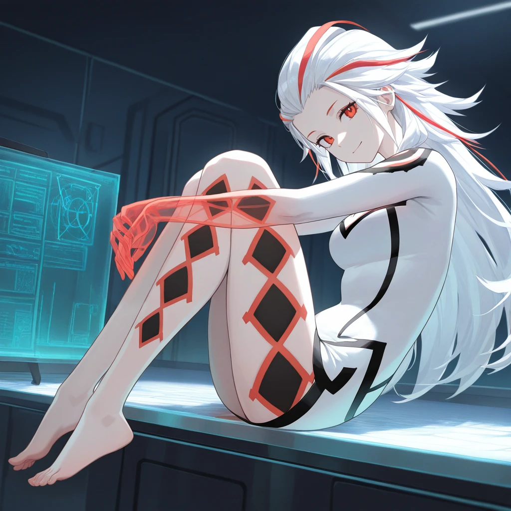 AibaSom, white hair, long hair, personification, streaked hair, red hair, red eyes, colored skin, pale skin, leg tattoo, short dress, white dress, black trim, see-through body, see-through hands, white sleeves,