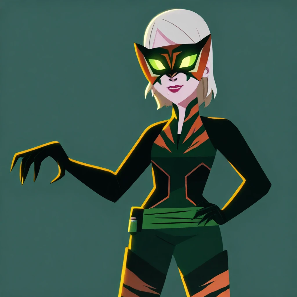mask, night-goggles, glowing green eyes, black bodysuit, green bodysuit, skin tight, orange stripes, light-green belt, black thigh-high heel boots,