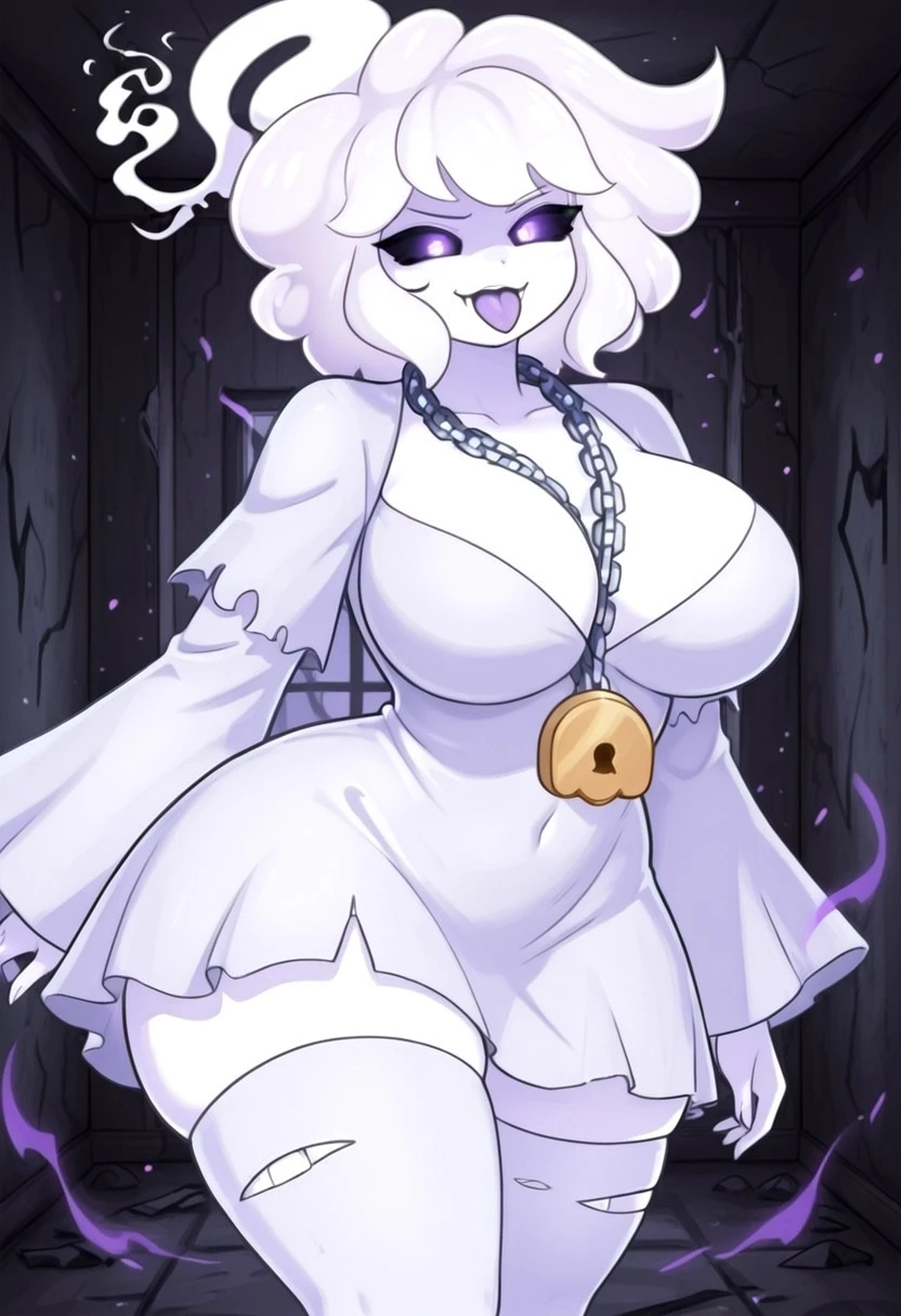 Ghost girl, white body, short hair, white hair, purple eyes, glowing eyes, black sclera, big breasts, wide hips