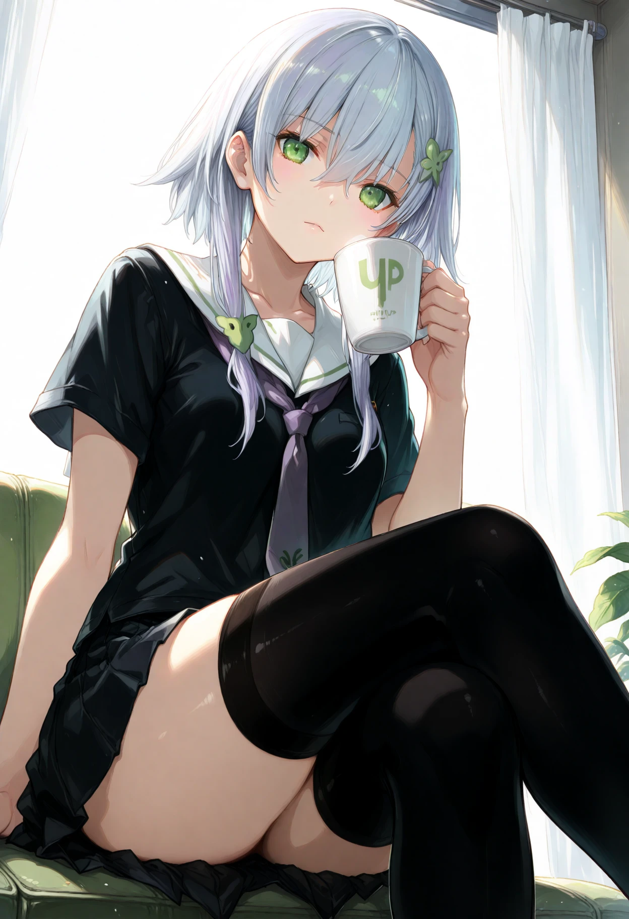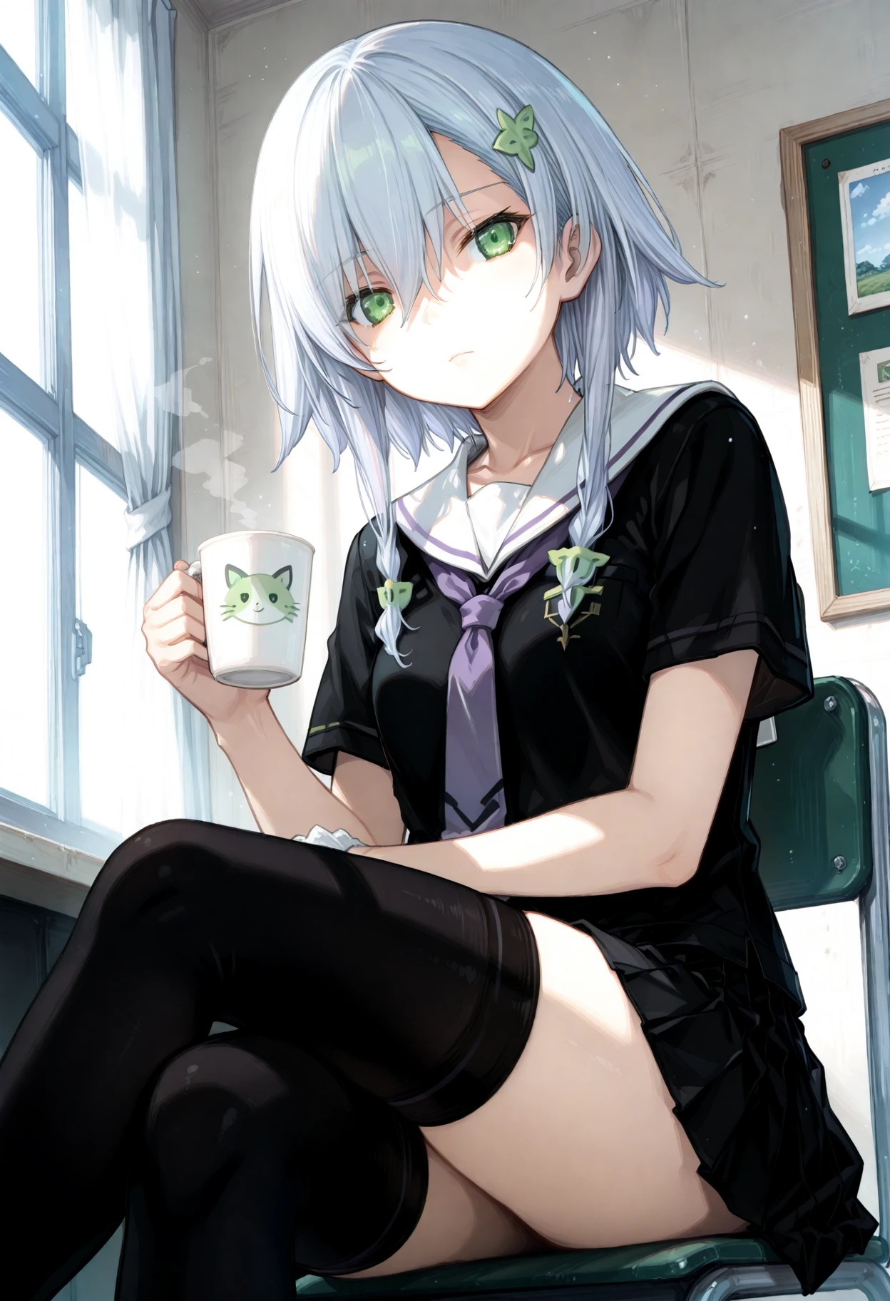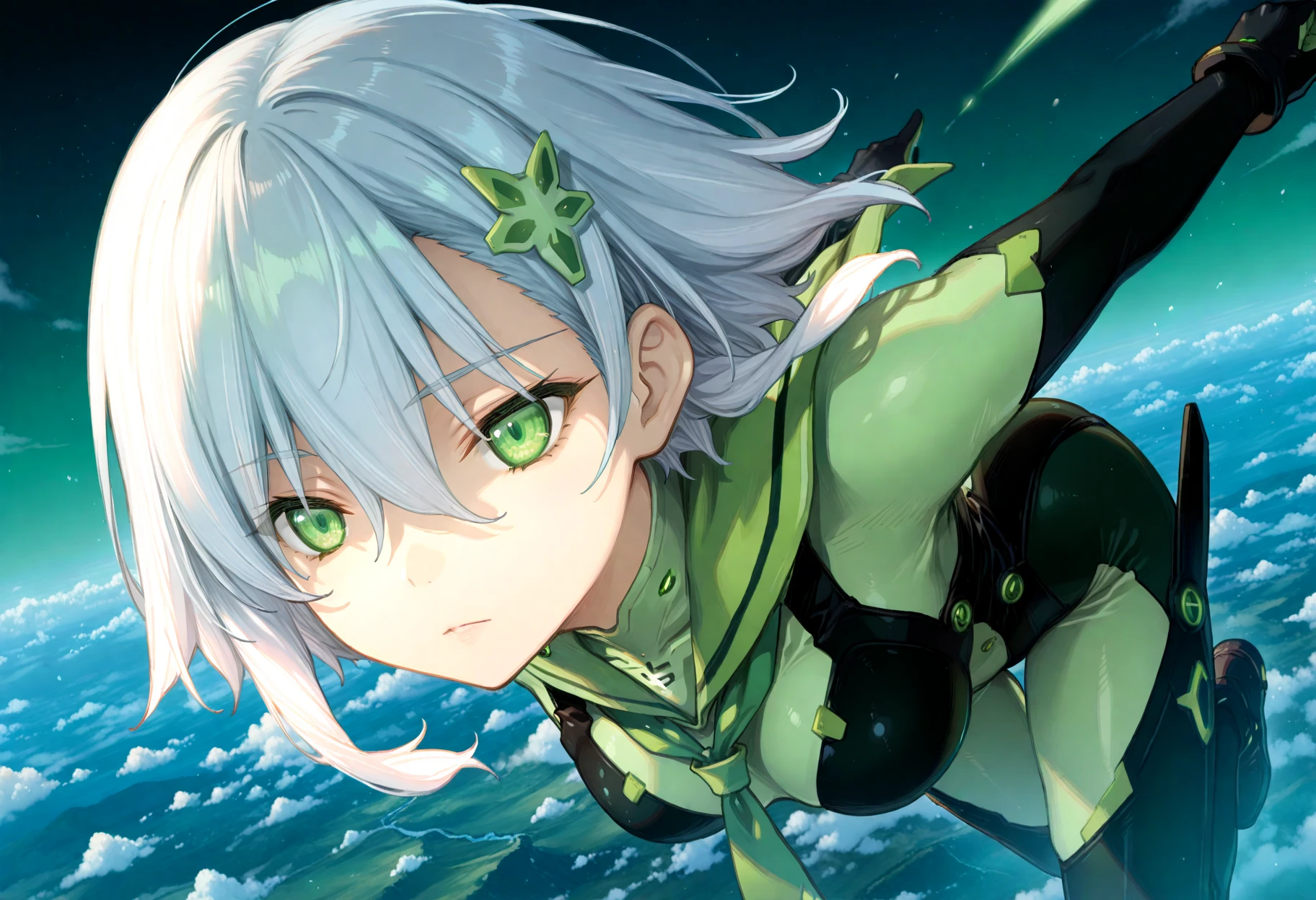 Saki Inui, white hair, green eyes, hair ornamentFor school outfit add this to base prompt:
