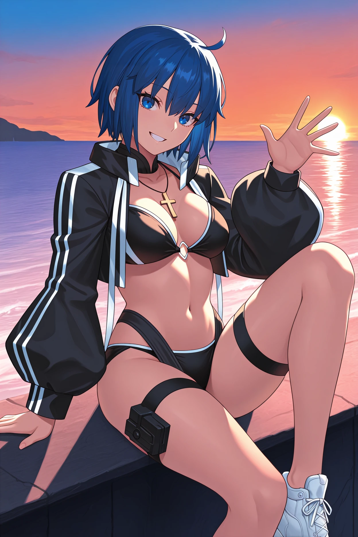 Add "opncl, ahoge, blue hair, short hair, hair between eyes, blue eyes, cross necklace, open jacket, cropped jacket, black jacket, puffy long sleeves, black bikini, thigh strap, white sneakers" for her Open Summer swimsuit.