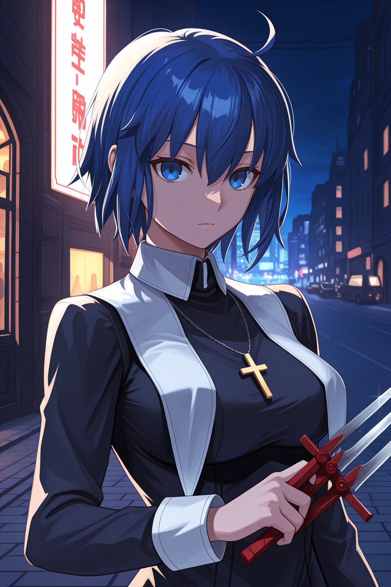 Add "mltcl, ahoge, blue hair, short hair, hair between eyes, blue eyes, cross necklace, collared dress, traditional nun, wrist cuffs, white collar, long sleeves, black boots, high heel boots" for her default Melty Blood outfit. (Add "weapon, blade" for her blades; these are quite inconsistent)