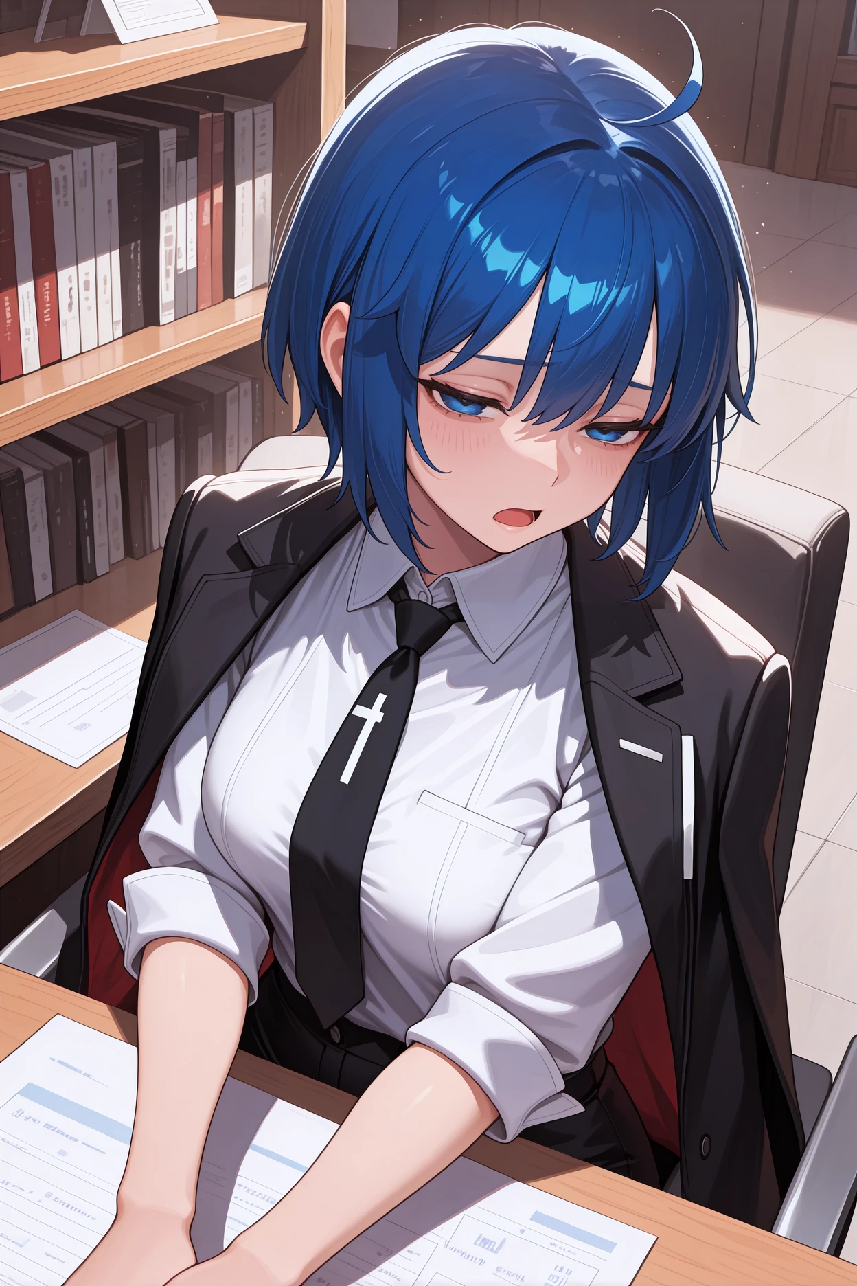 Add "sencl, ahoge, blue hair, short hair, hair between eyes, blue eyes, black jacket, jacket on shoulders, white shirt, collared shirt, sleeves rolled up, black necktie, black skirt, black belt, black gloves, multiple belts, black pantyhose, high heel boots, black boots, knee boots" for C.I.E.L. (2nd Ascension), or her Ciel-Sensei outfit.