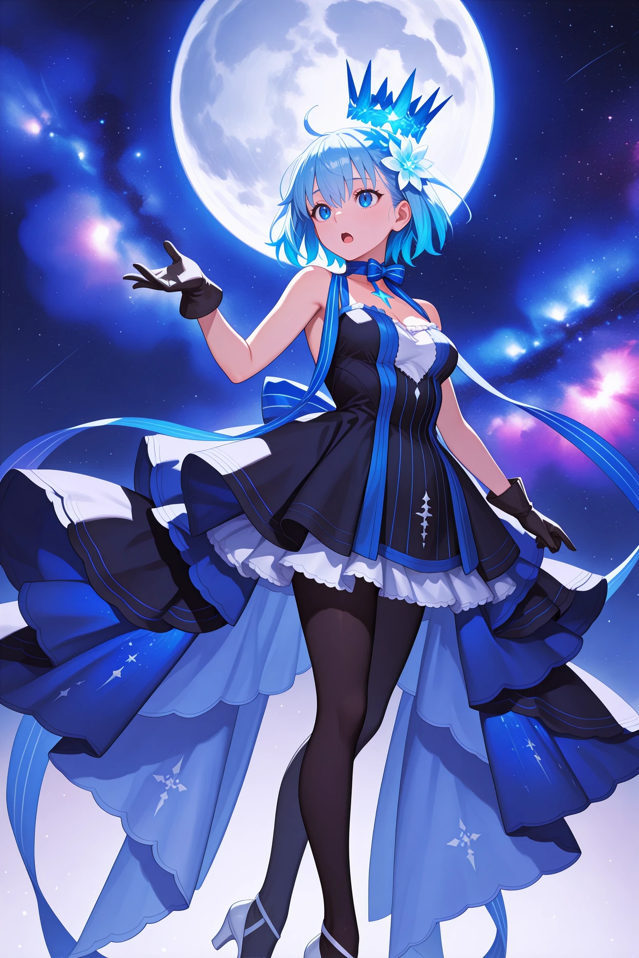 Add "strcl, ahoge, blue hair, short hair, hair between eyes, blue eyes, gradient hair, light blue hair, blue crown, hair flower, blue flower, blue choker, black dress, blue dress, layered dress, white frills, bare shoulders, cleavage, blue bow, striped bow, blue ribbon, striped ribbon, black gloves, black pantyhose, white high heels" for C.I.E.L. (3rd Ascension), or her Star Ciel outfit.