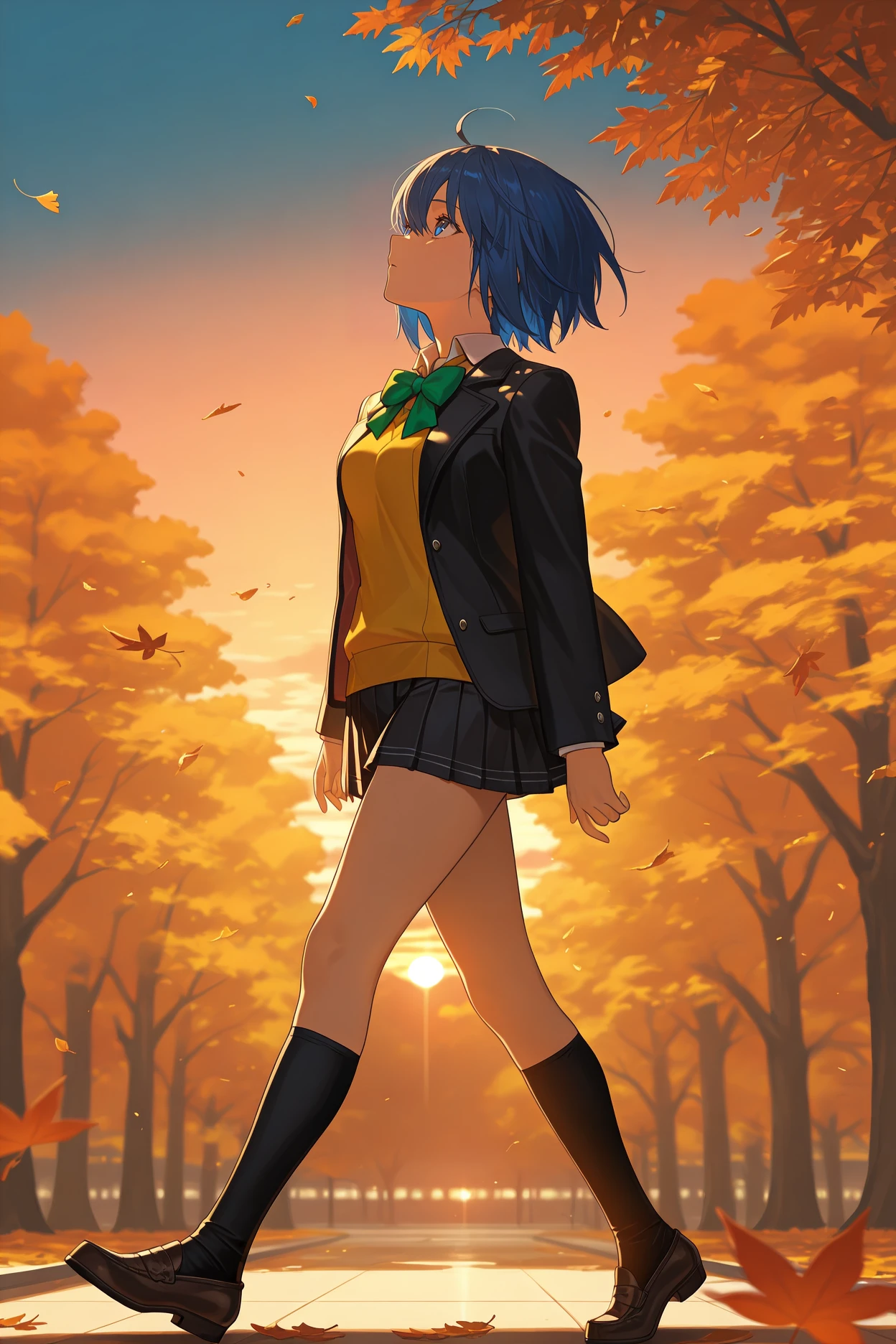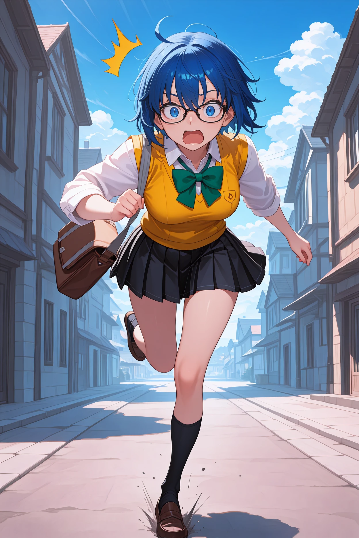 Add "defcl, ahoge, blue hair, short hair, hair between eyes, blue eyes, glasses, black-framed eyewear, yellow sweater vest, green bowtie, white shirt, collared shirt, long sleeves, black skirt, pleated skirt, miniskirt, black socks, kneehighs, loafers" for her regular look without her jacket.