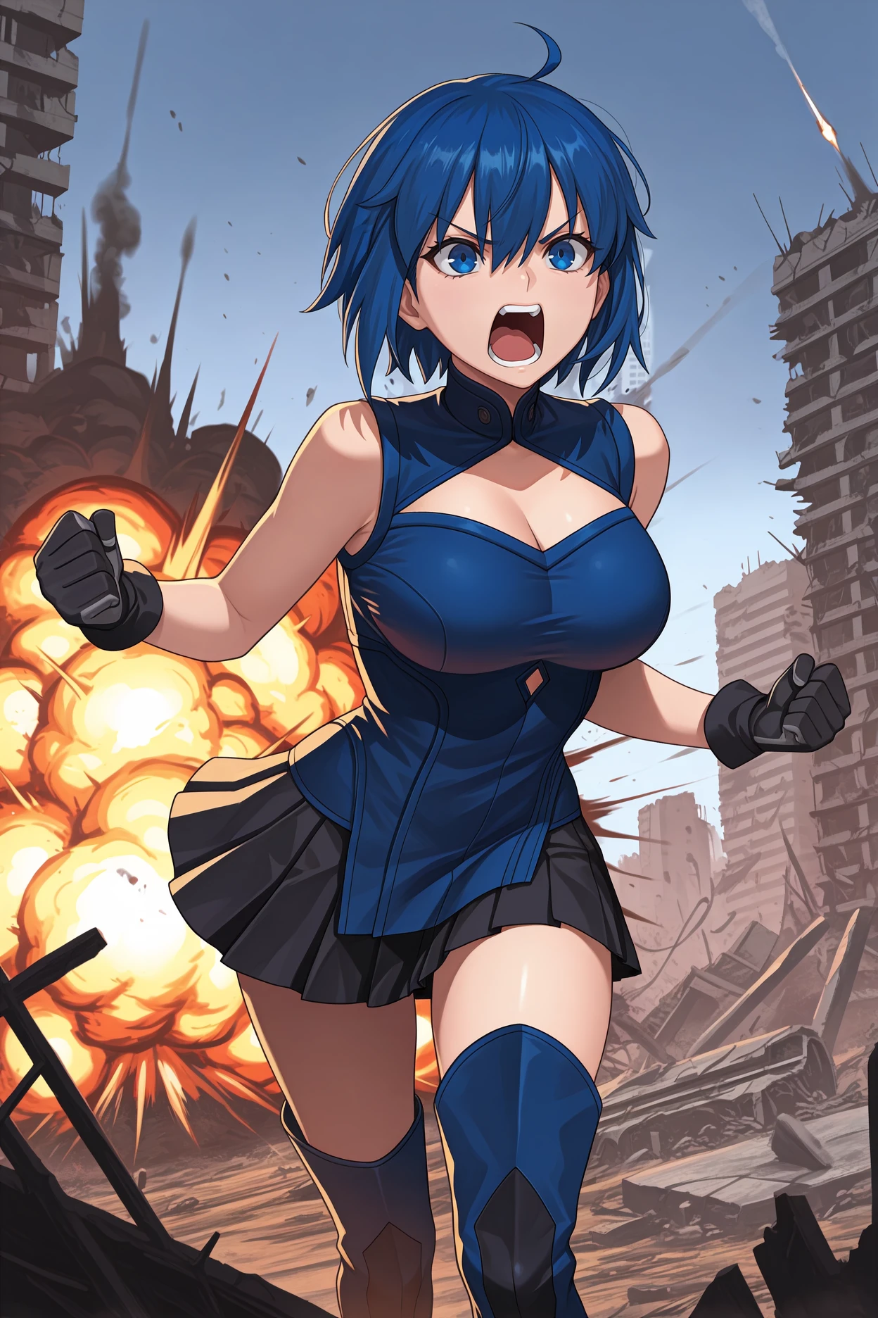 Add "pwrcl, ahoge, blue hair, short hair, hair between eyes, blue eyes, blue dress, sleeveless dress, short dress, cleavage cutout, diamond cutout, black skirt, pleated skirt, black gloves, blue thigh boots" for her Powered Ciel outfit.