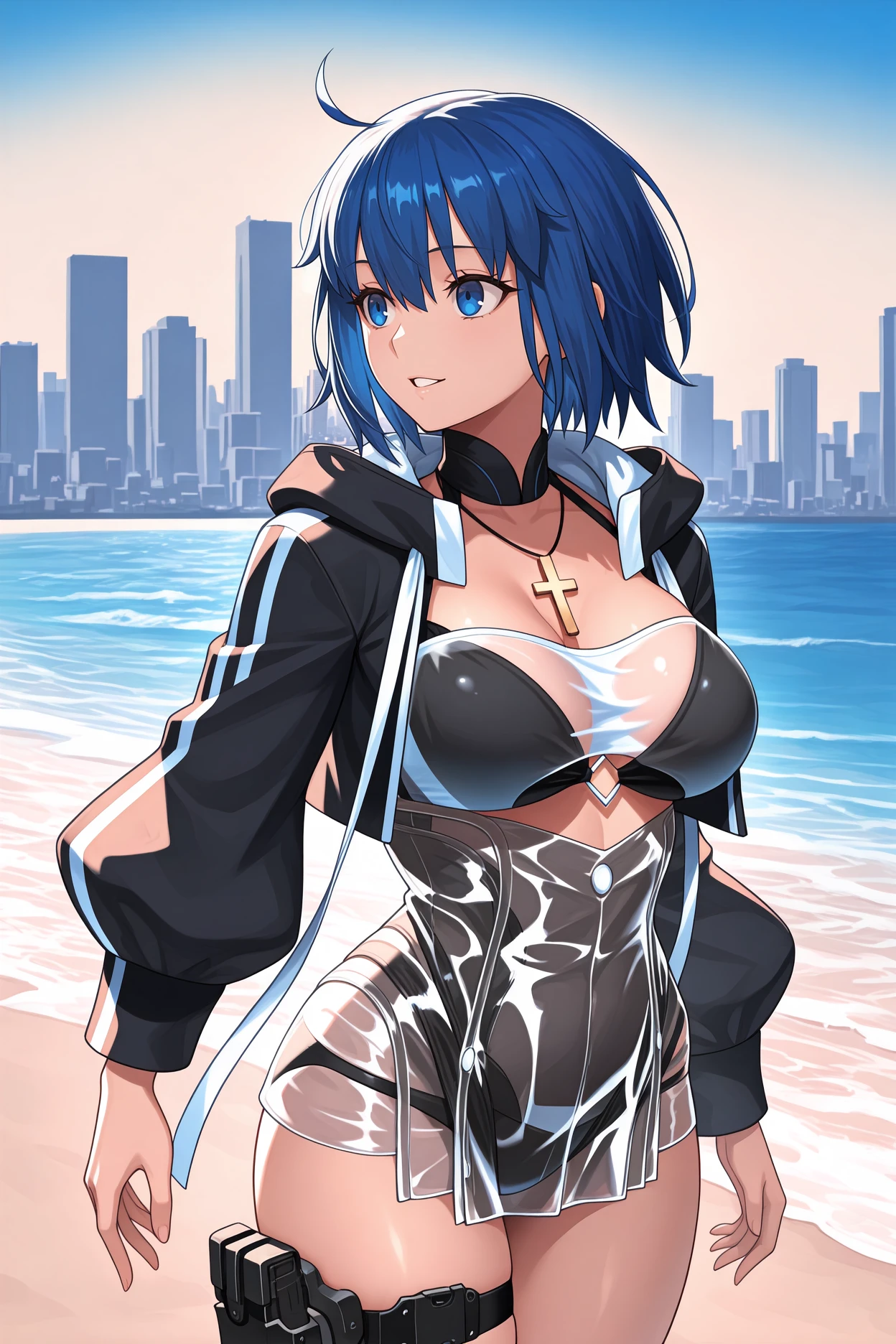 Add "mstcl, ahoge, blue hair, short hair, hair between eyes, blue eyes, cross necklace, see-through dress, short dress, bikini under clothes, black bikini, black jacket, hooded jacket, cropped jacket, puffy long sleeves, thigh strap, thigh holster, white sneakers" for C.I.E.L. (1st Ascension).