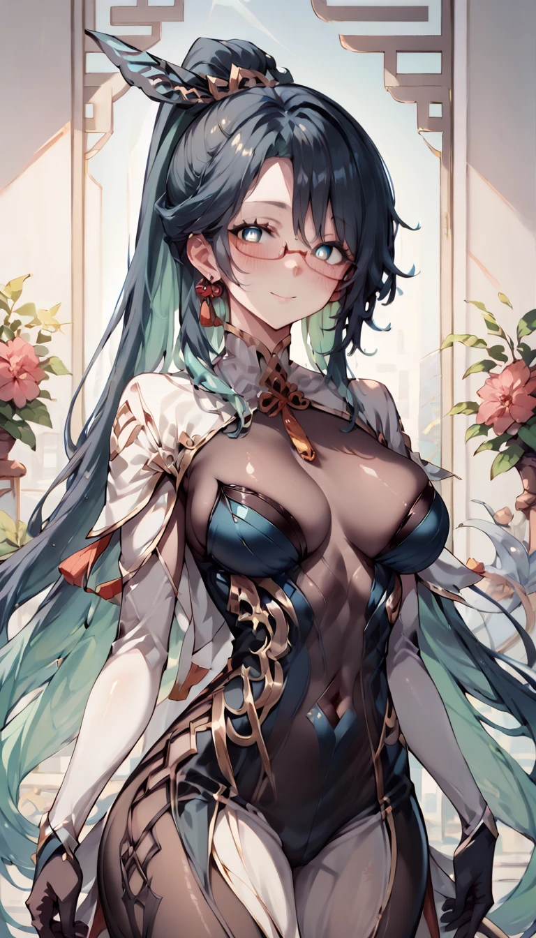 "black dress" "leotard" "glasses" or "semi-rimmed glasses" for outfit, if not specified itll generally create her outfit unless she's in a weird pose or other tags cause different outfits.