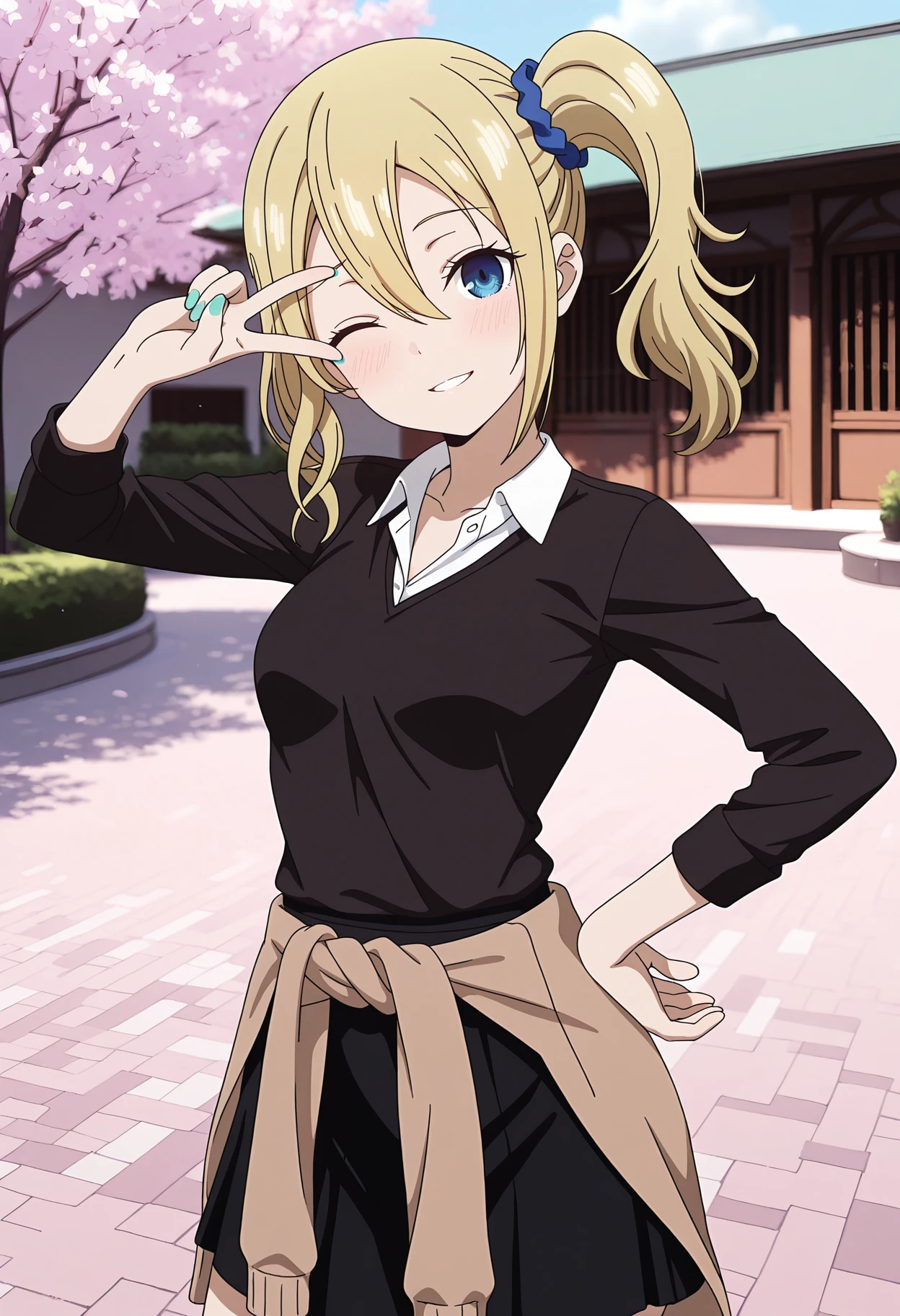 KJOhayasaka, blonde hair, blue eyes, hair between eyes, side ponytail, blue scrunchie,