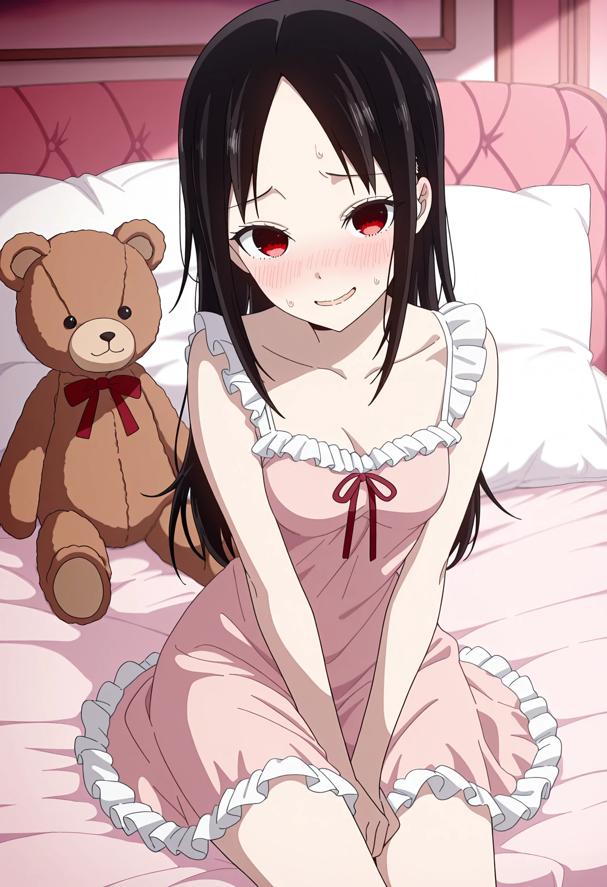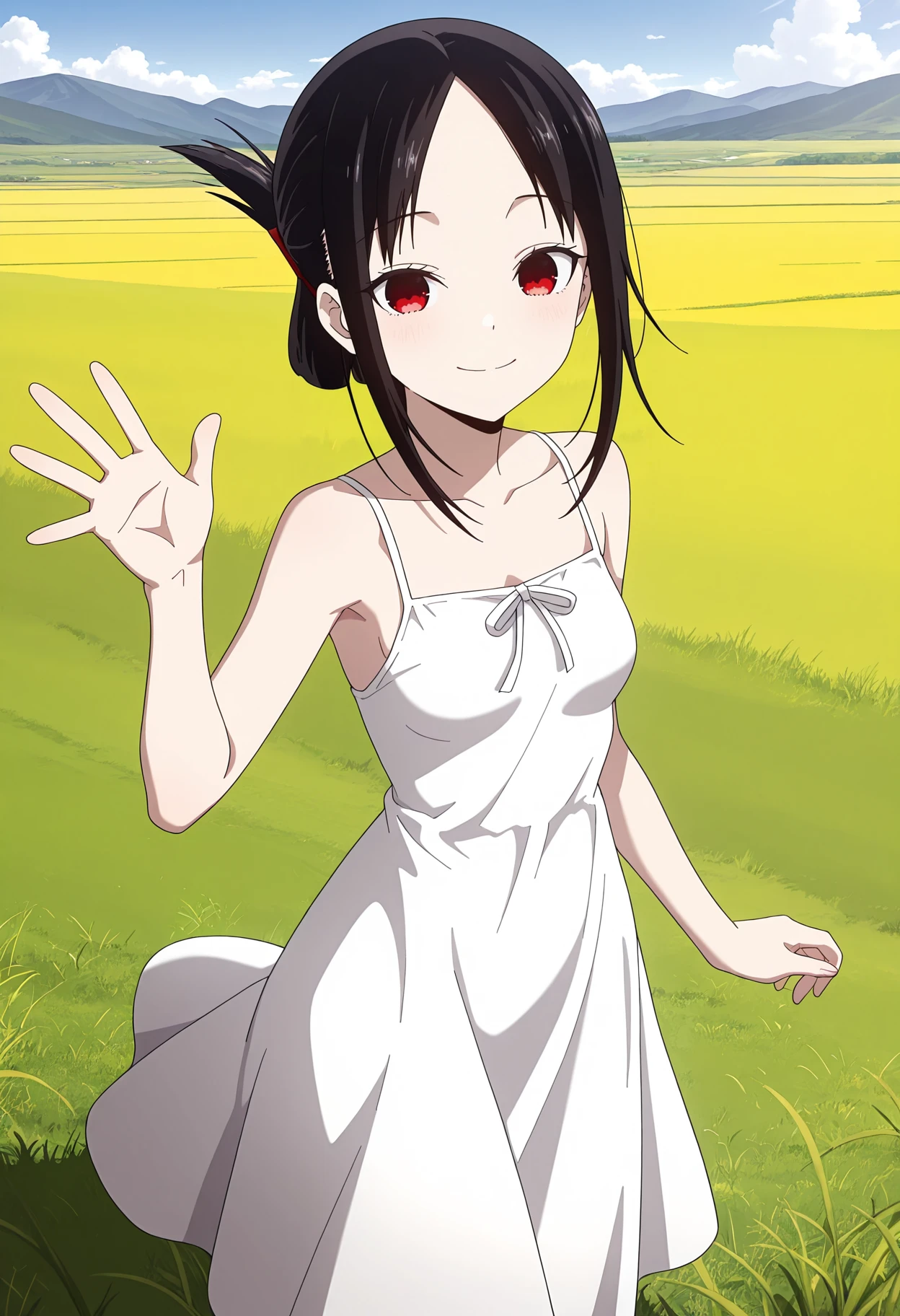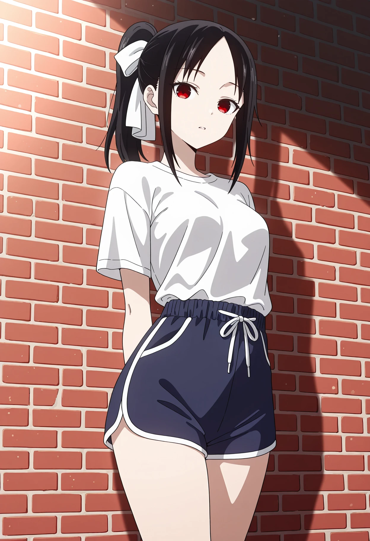 KJOkaguya, black hair, red eyes, parted bangs, high ponytail, hair ribbon,
