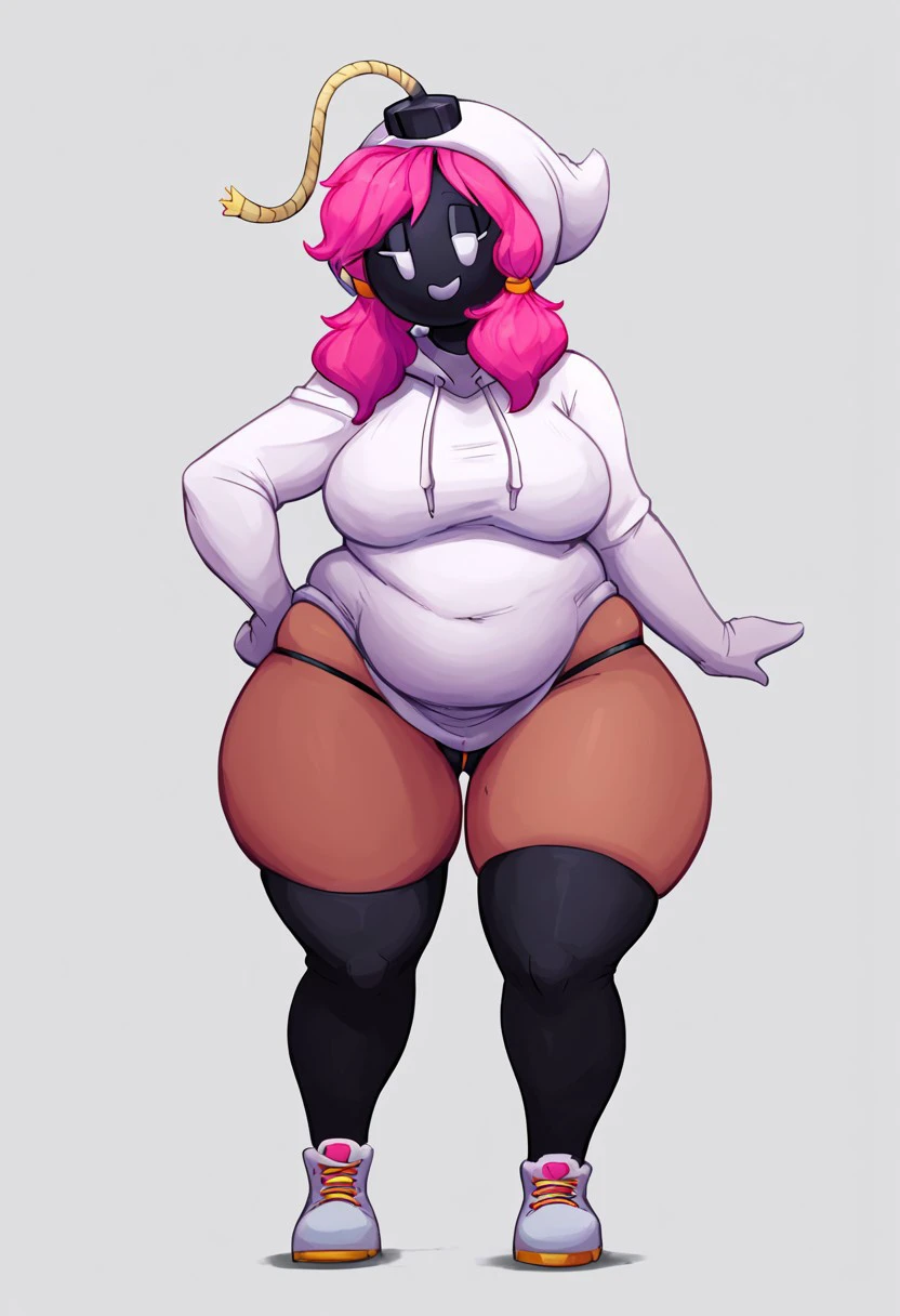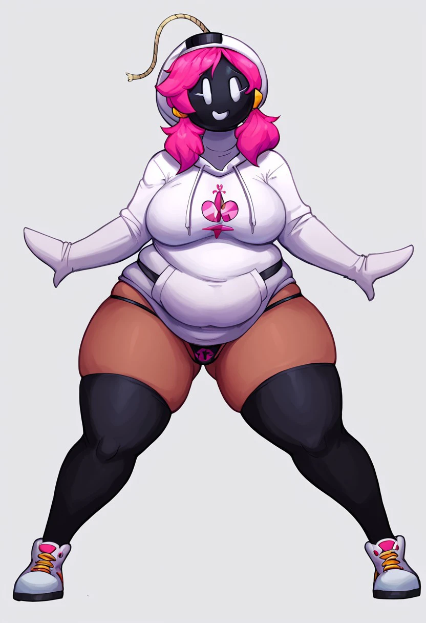 shybomb, bomb head, black mask, white eyes, simple eyes, simple face, fuse, pink hair, fuse, twintail hair, dark skin,