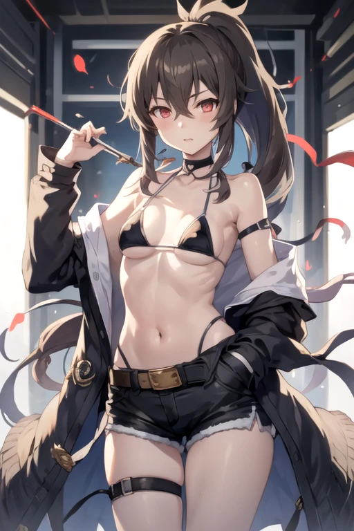 M4chineCollector, 1girl, solo, long hair, brown hair, black hair, red eyes, navel, hair between eyes, bare shoulders, medium breasts, collarbone, ponytail, black bikini, shorts, choker, belt, open clothes, grey coat, thigh strap, bikini top only