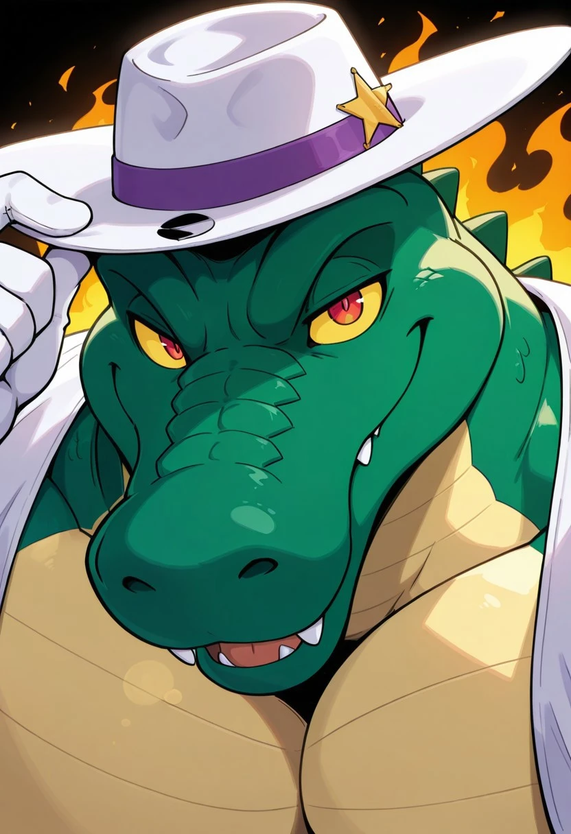 Pursuer_Agares, Furry, Crocodile, Green body, two tone body, yellow scelera, red eyes, tail, obese, muscular arms, muscular legs, White Cowboy hat, White Open Vest, Gold Sheriff Badge, White Gloves, Purple Jockstrap, White Cowboy boots, Gold Spurs, Gold Revolver (weapon), white gun holster, white lasso