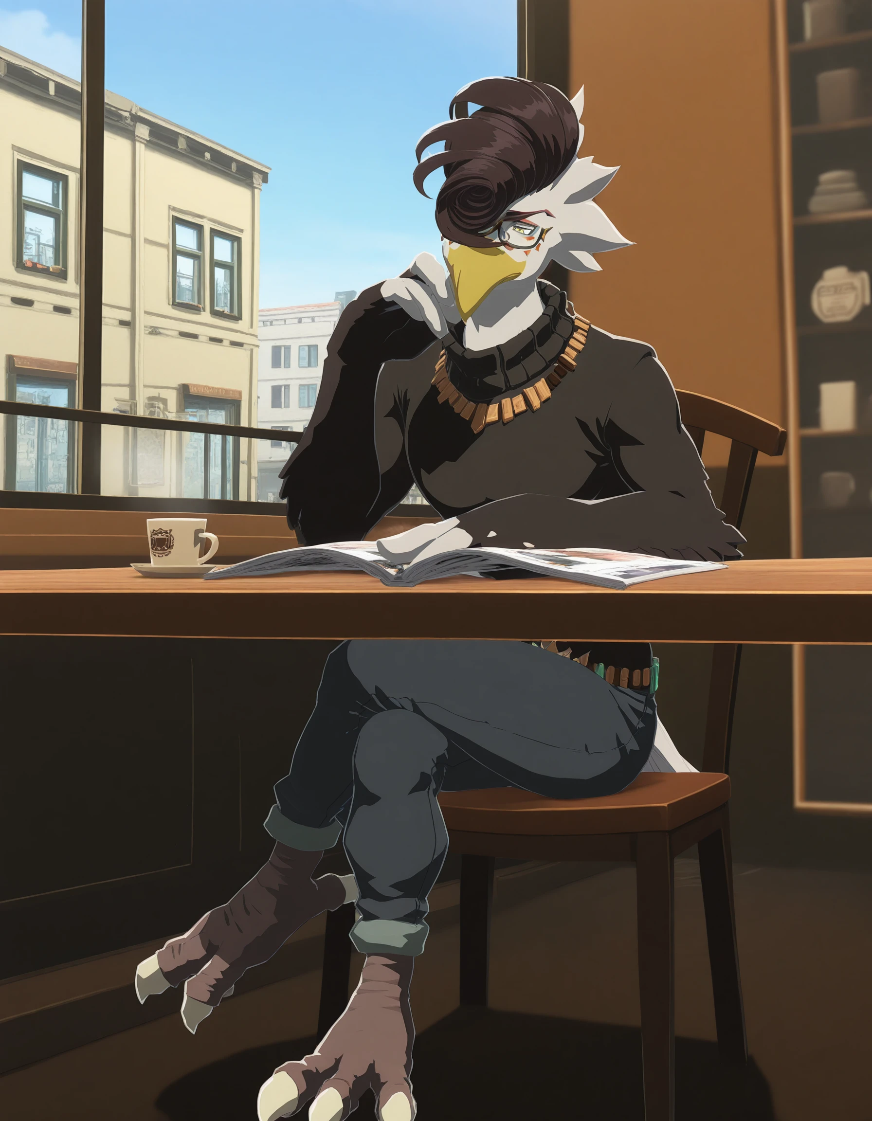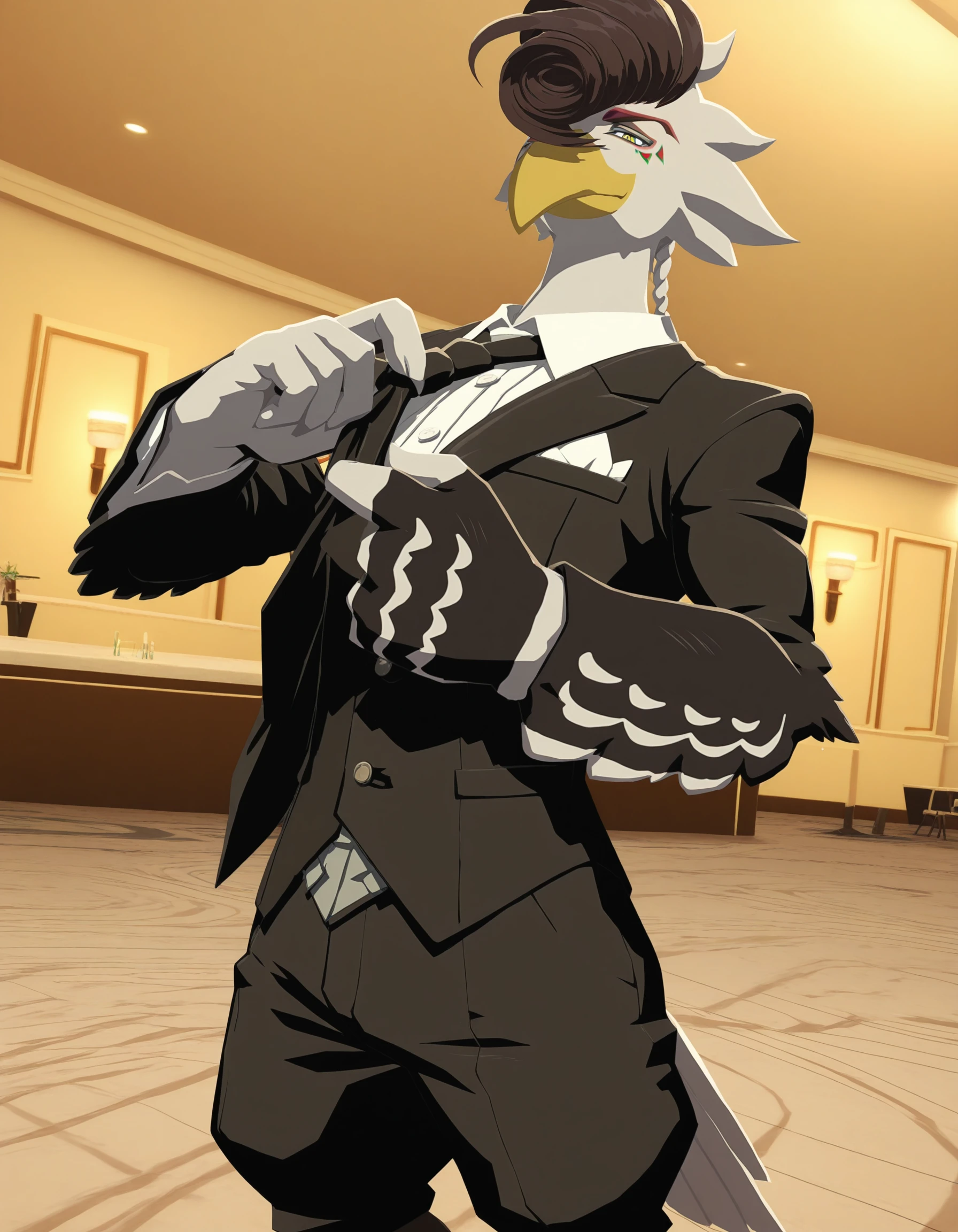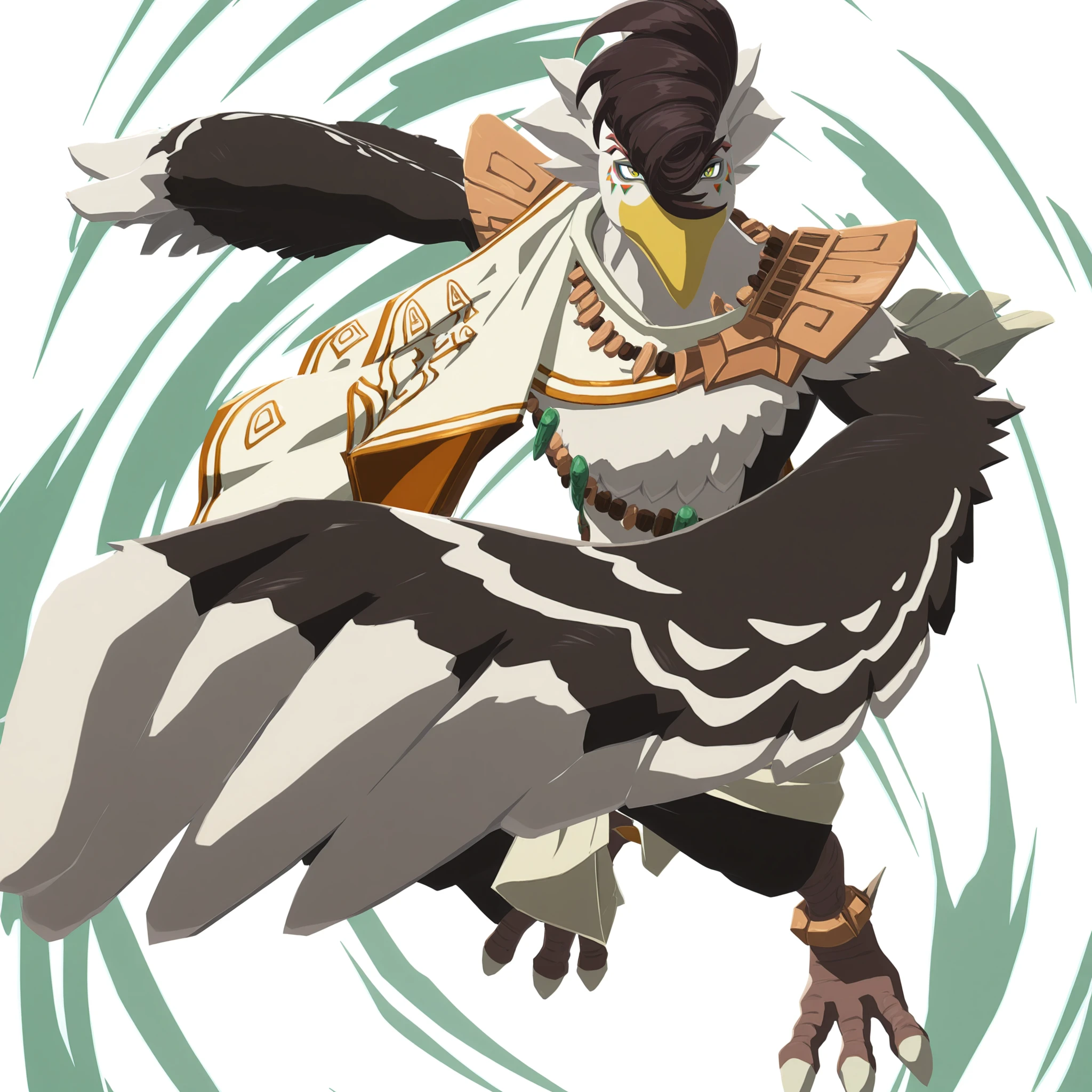 r2ph1c2, 1boy, rito, furry male, bird boy, two-tone feathers, beak, facepaint, pompadour,