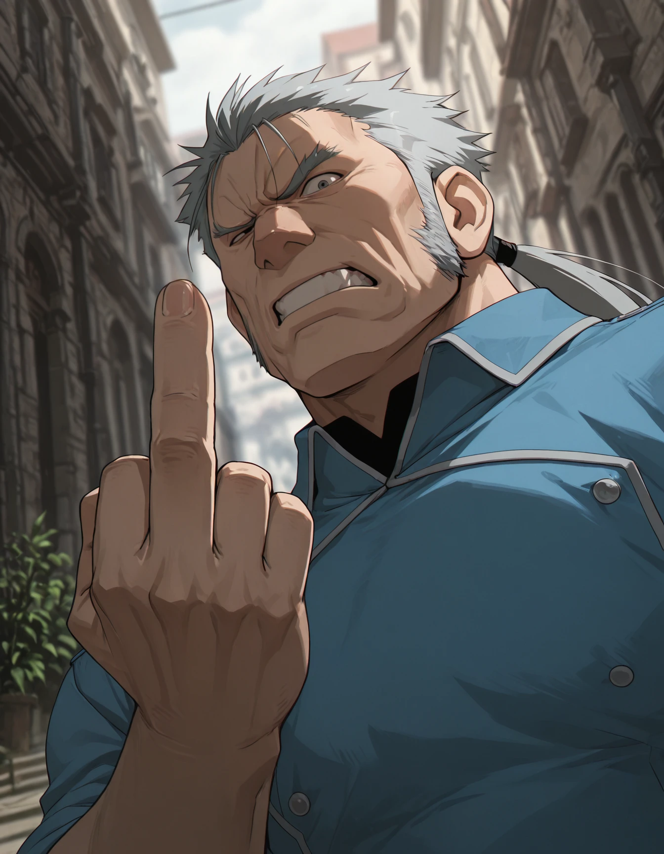 r0a, 1boy, solo, muscular, grey hair, bara, sideburns, long hair
