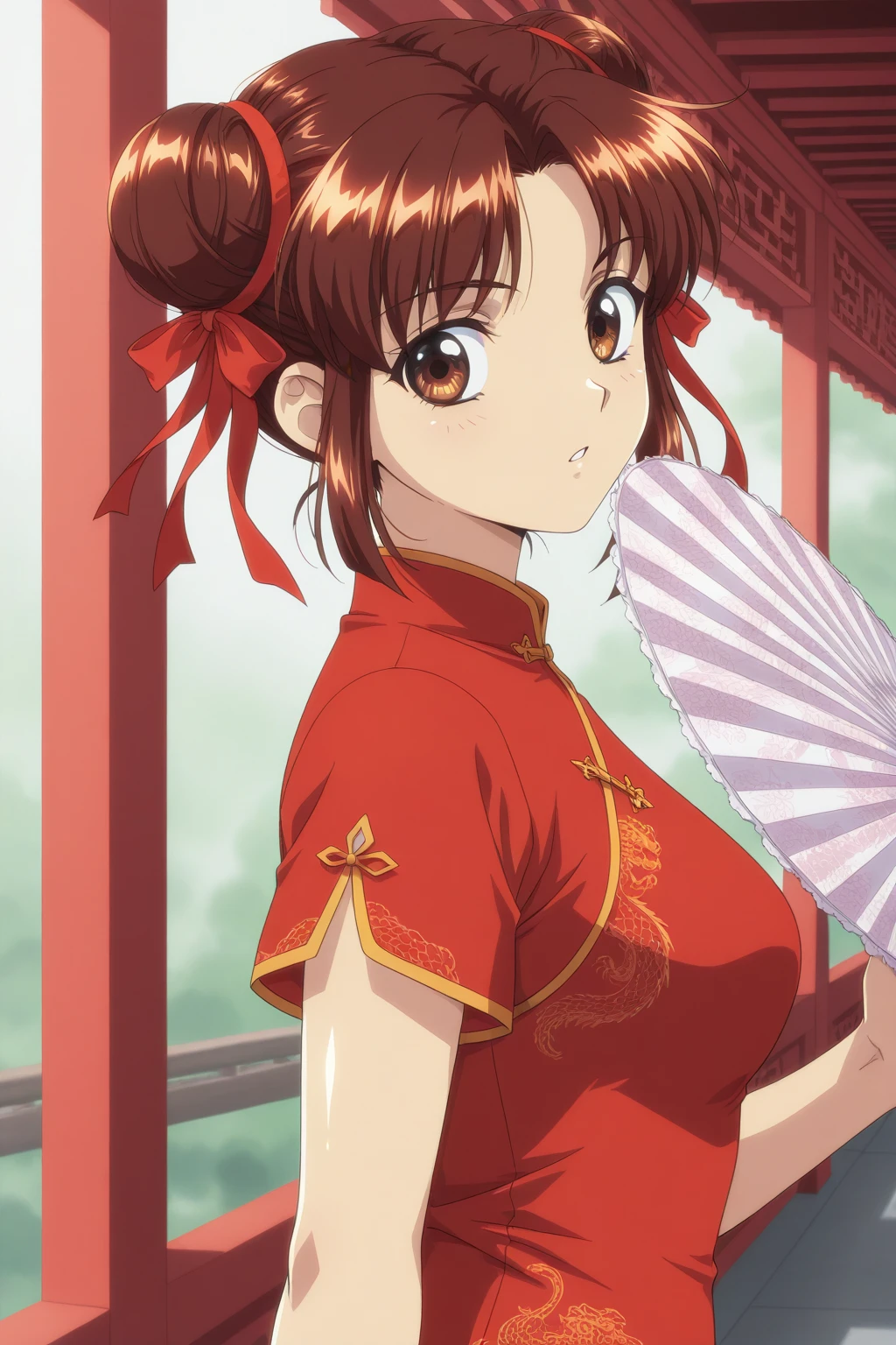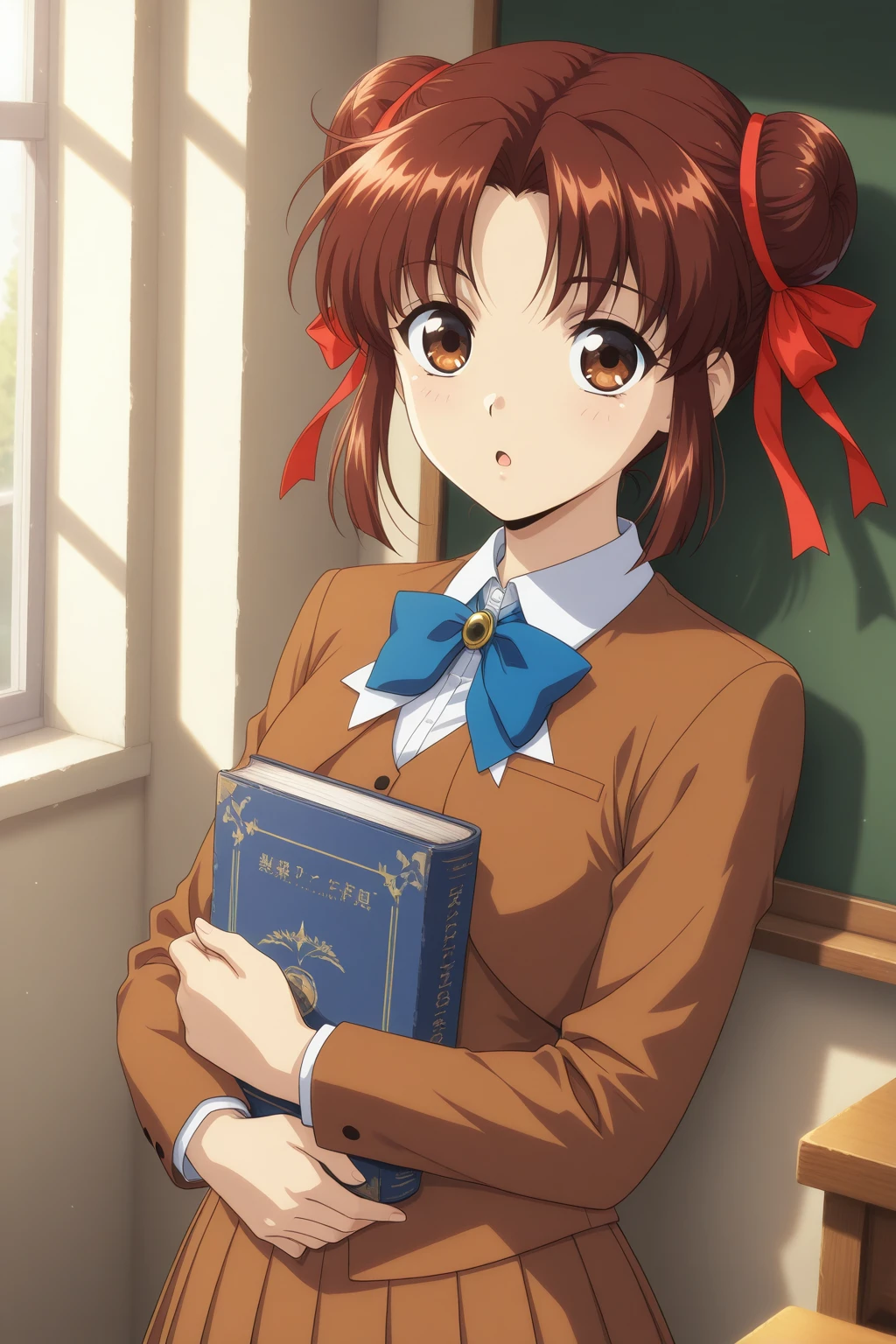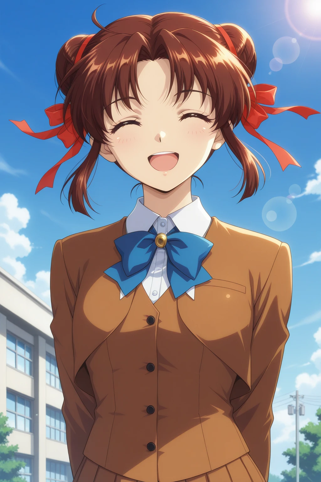 YMFY, short hair, brown hair, double bun, parted bangs, brown eyes, hair ribbon, red ribbon, brown jacket, blazer, collared shirt, white shirt, blue bowtie, brown vest, brown skirt, pleated skirt, miniskirt, kneehighs, white socks, loafers, black footwear