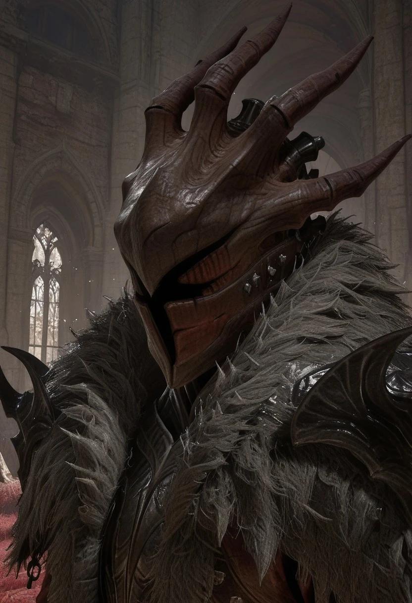 Gen.EngstromSDXL, helmet, coat, open coat, chestplate, fur trim, shoulder armor, gauntlets, greaves, boots
