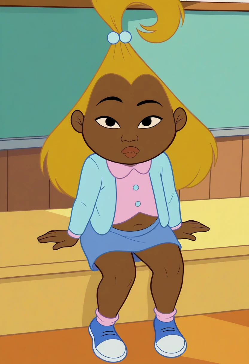 Basic prompts : 1girl, dijonayjones, blonde hair, dark skin, black eyes, long hair, hair bobbles, topknot, dark pink lips