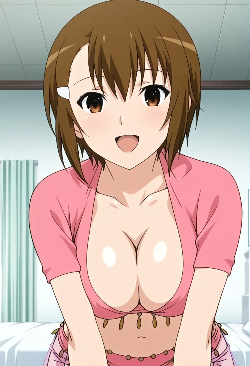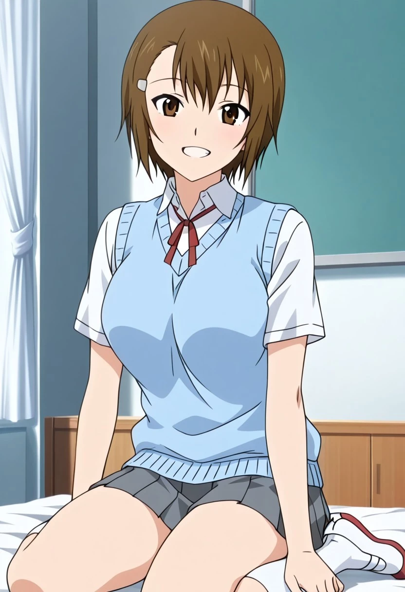 azumi souma joshikousei no koshitsuki anime style, hairclip, short hair, brown hair, brown eyes, large breasts,