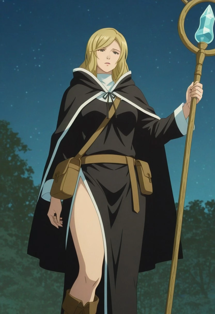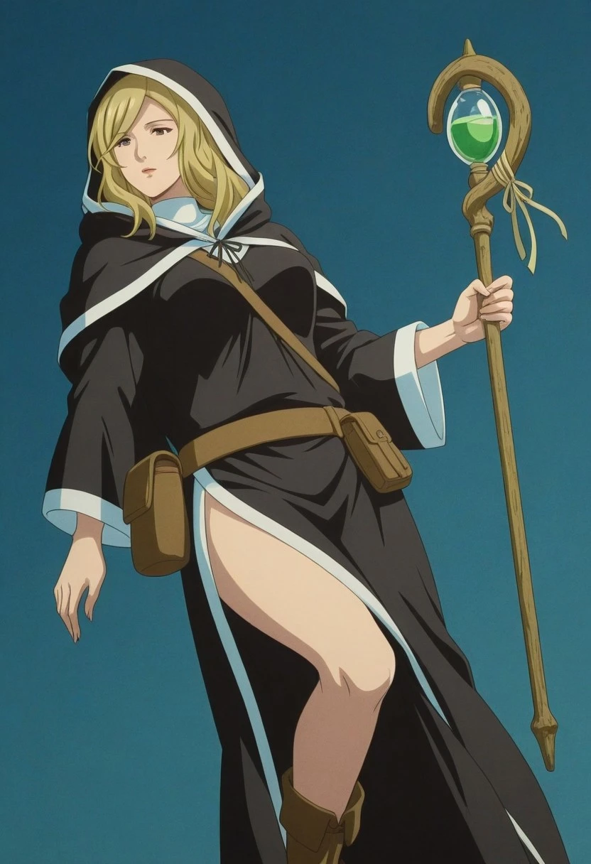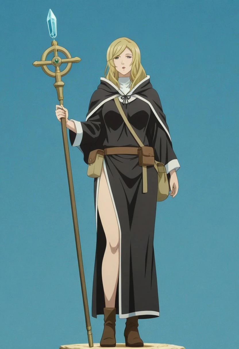 long black cleric robe with white trim, hooded mantle tied at the ????? with a ribbon, high-neck white inner garment, brown leather belt around the waist, small pouch and tan shoulder bag, long slit skirt revealing one leg, brown ankle boots, holding a crystal-tipped staff, medieval fantasy