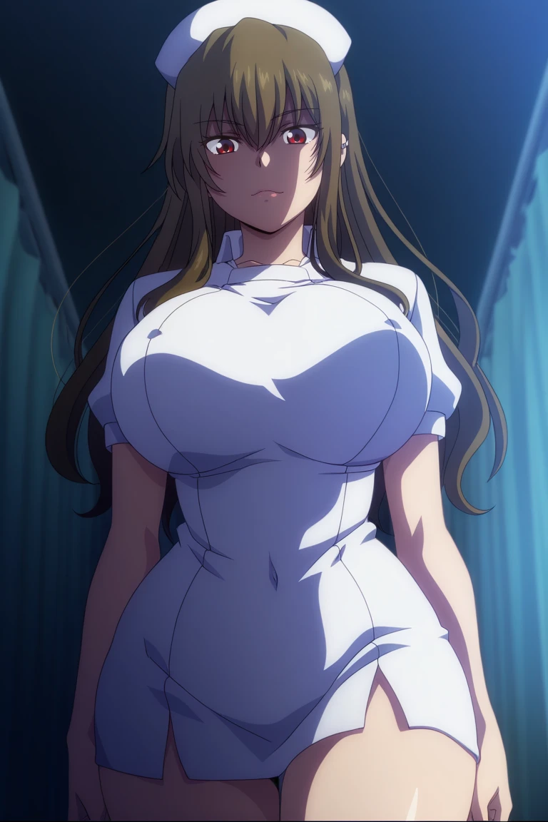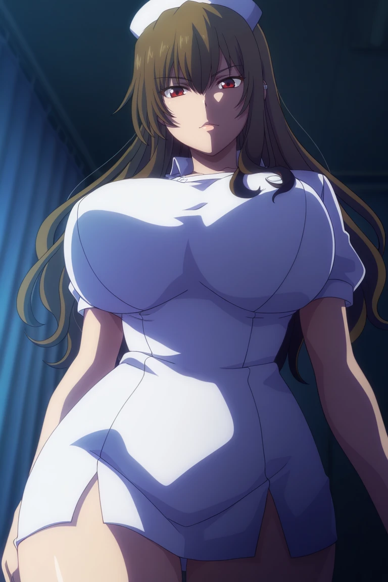 1girl, solo, Yamaguchi, long hair, brown hair, red eyes, glossy lips, big breasts, sexy, curvy, wide hips, thick thighs, official_style, anime_coloring