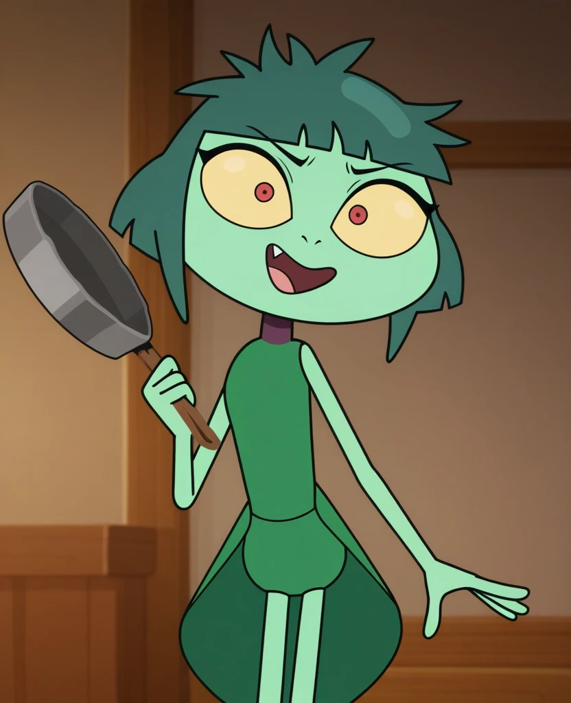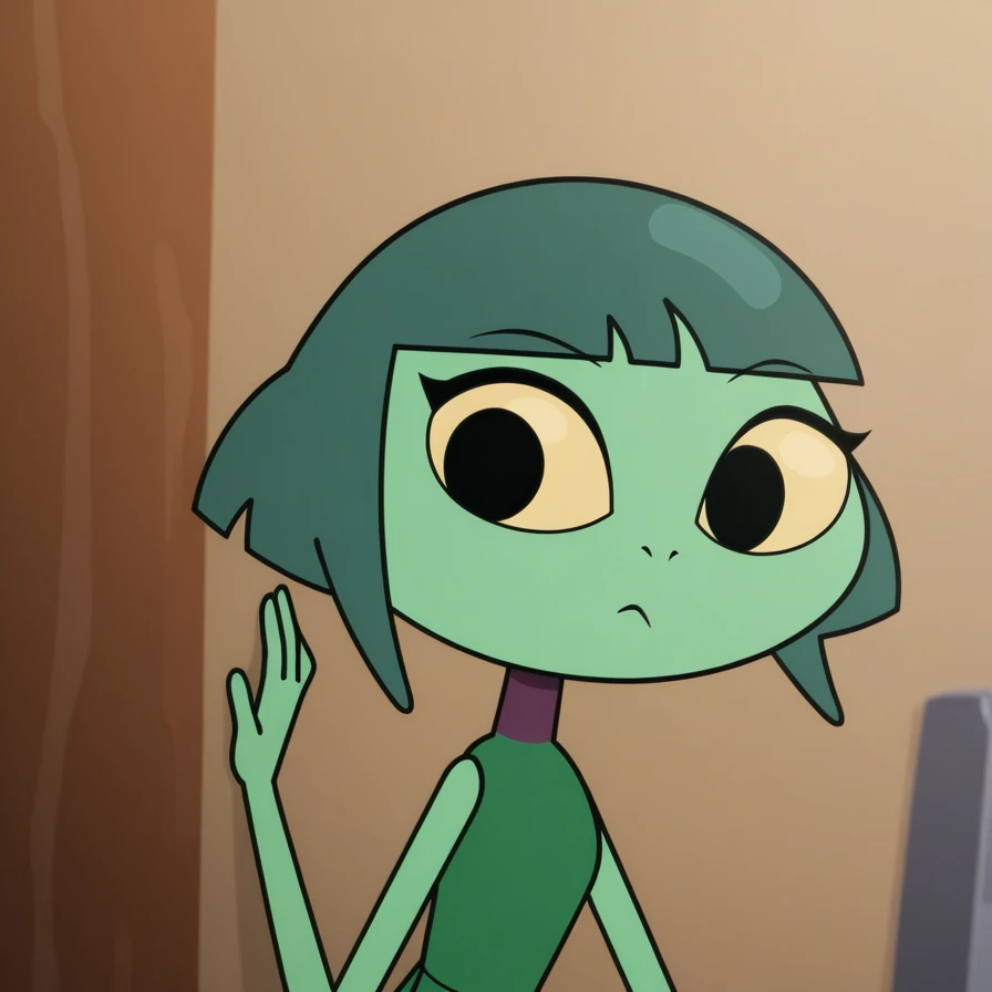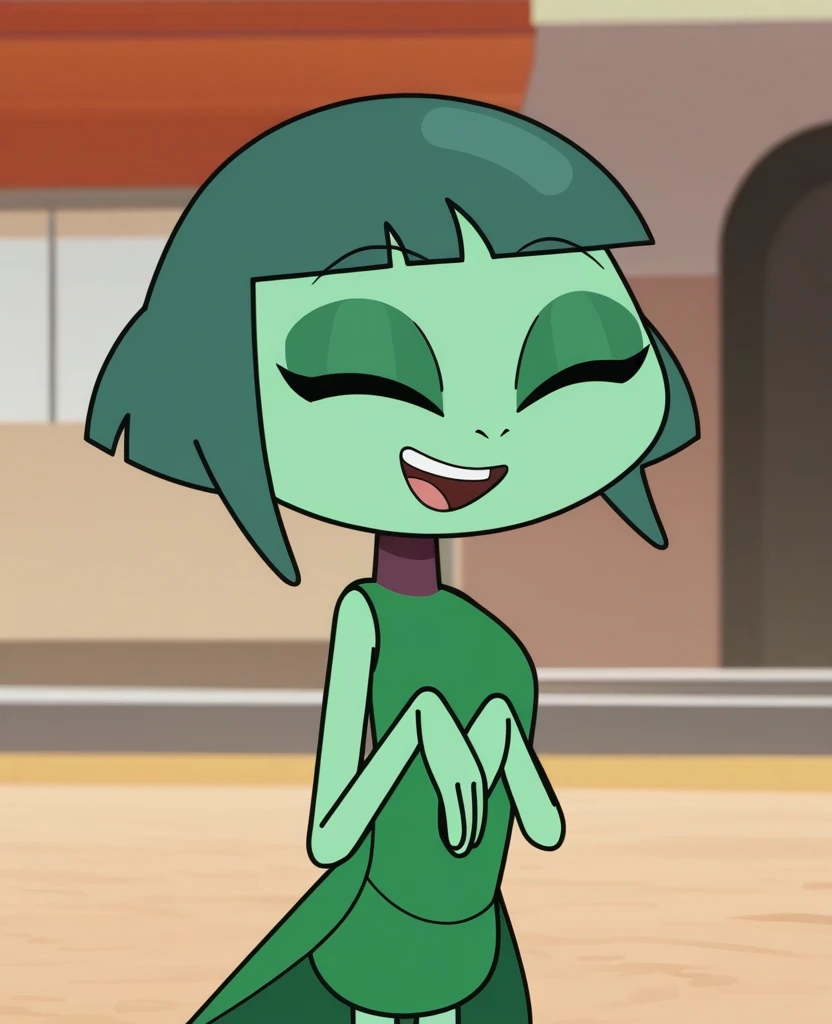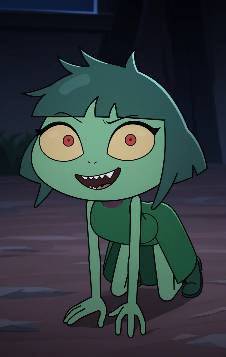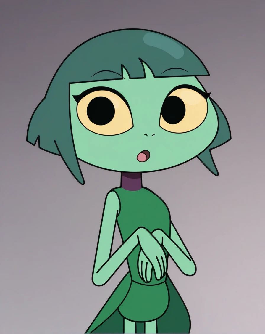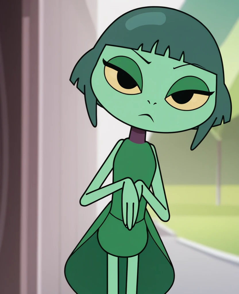 J4D3BBF, 1girl, arthropod girl, solo, light-green skin, colored skin, black eyes, yellow sclera, dark-green hair, short hair, bangs, green dress, sleeveless dress,