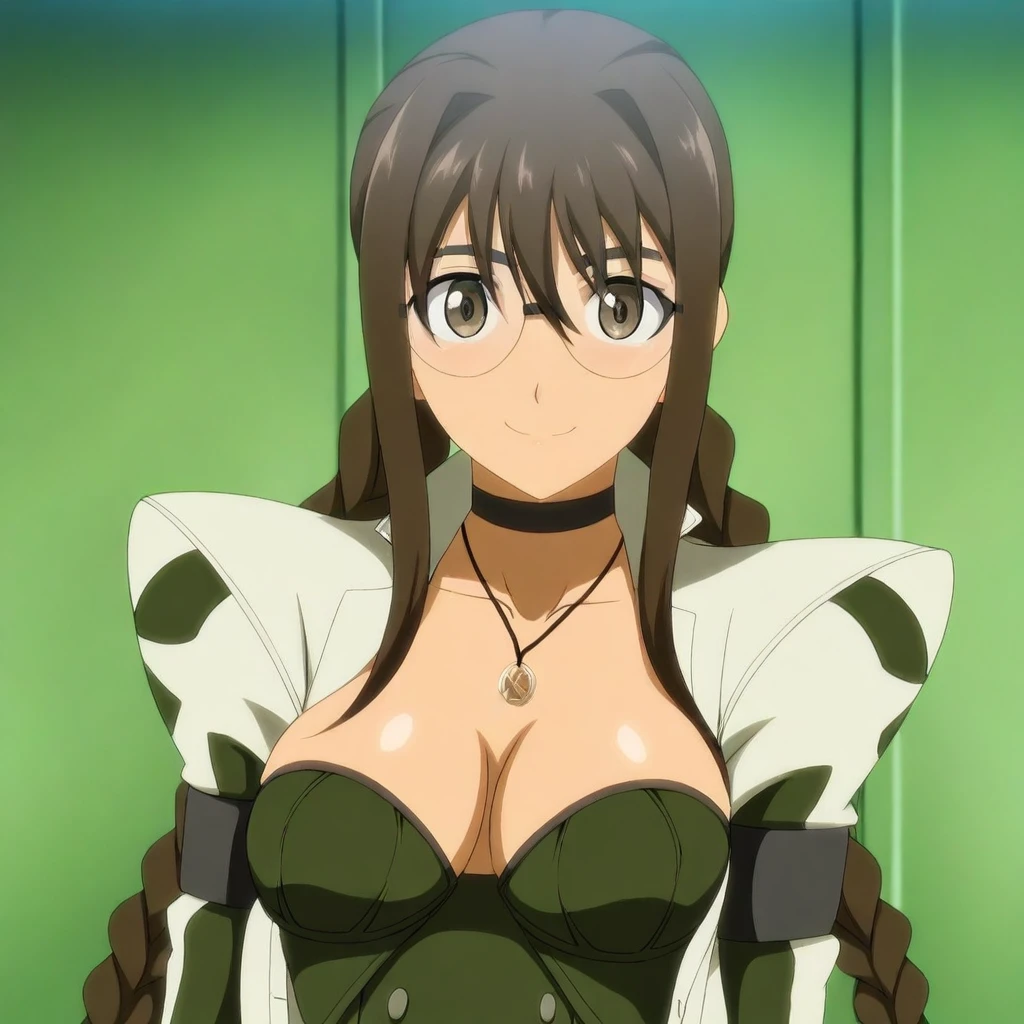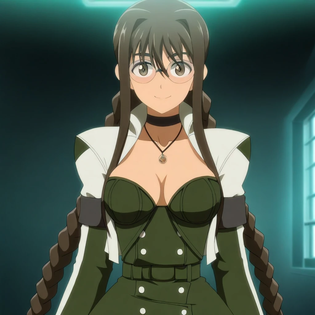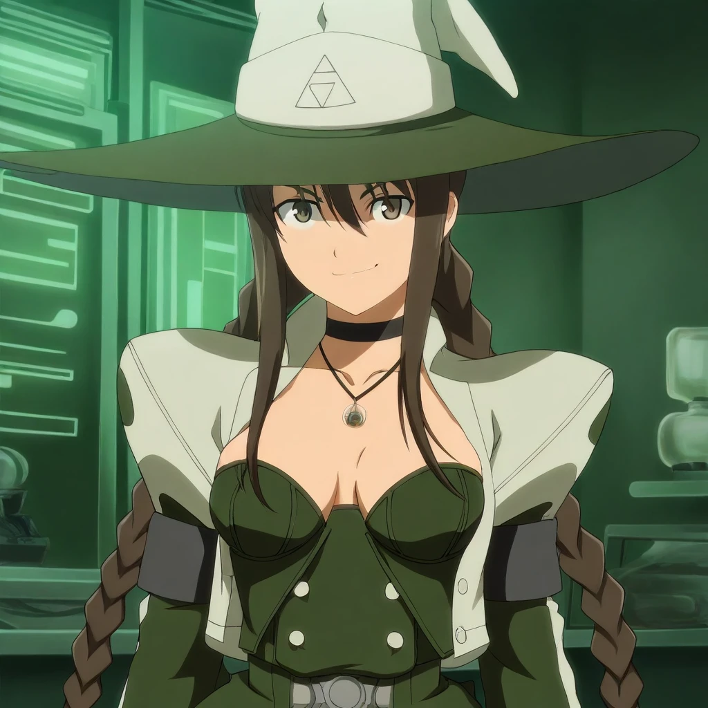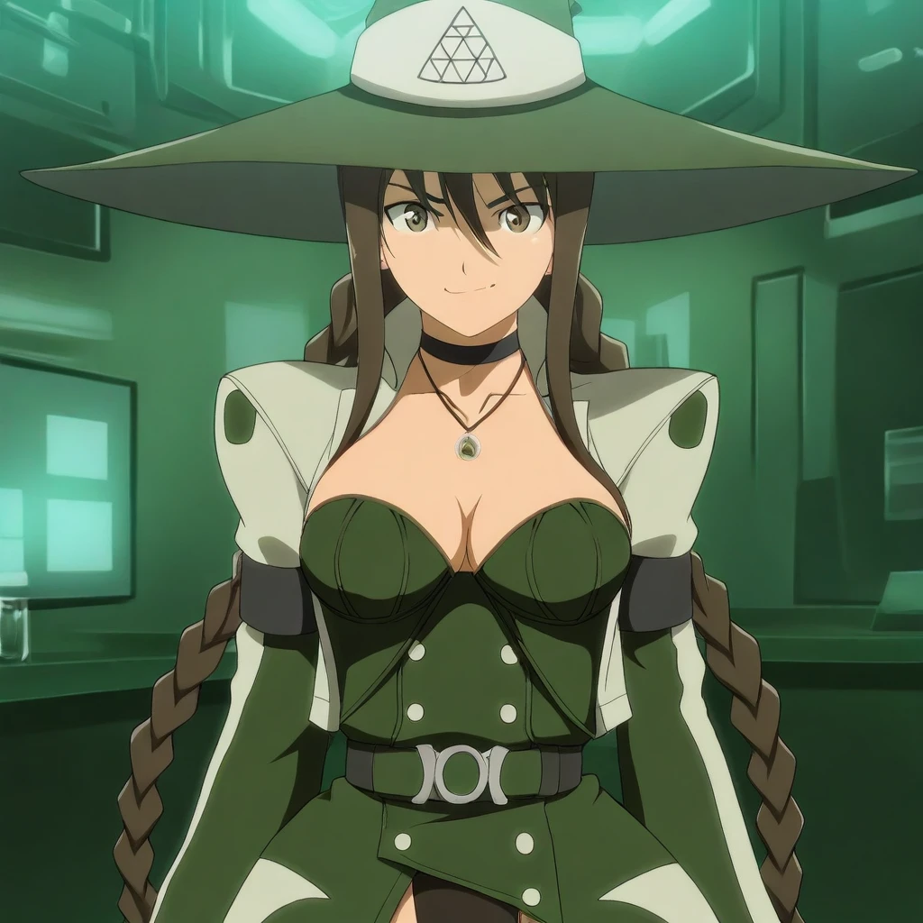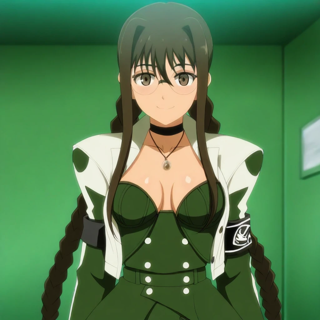 white jacket, dark-green sleeves, long sleeves, black armbands, dark-green bustier, buttons, cleavage, choker, necklace, pendant, belt, belt buckle, dark-green long-skirt, white trim, black leotard,