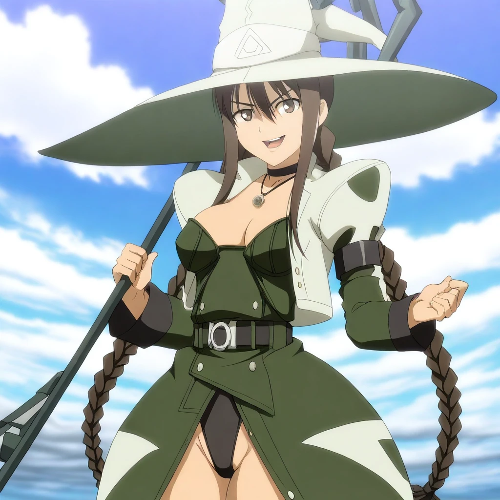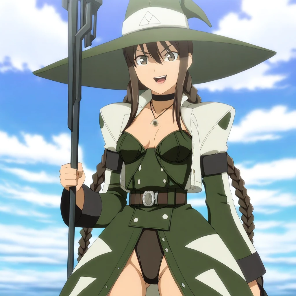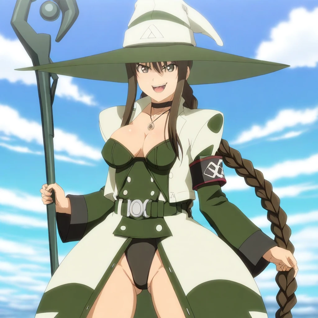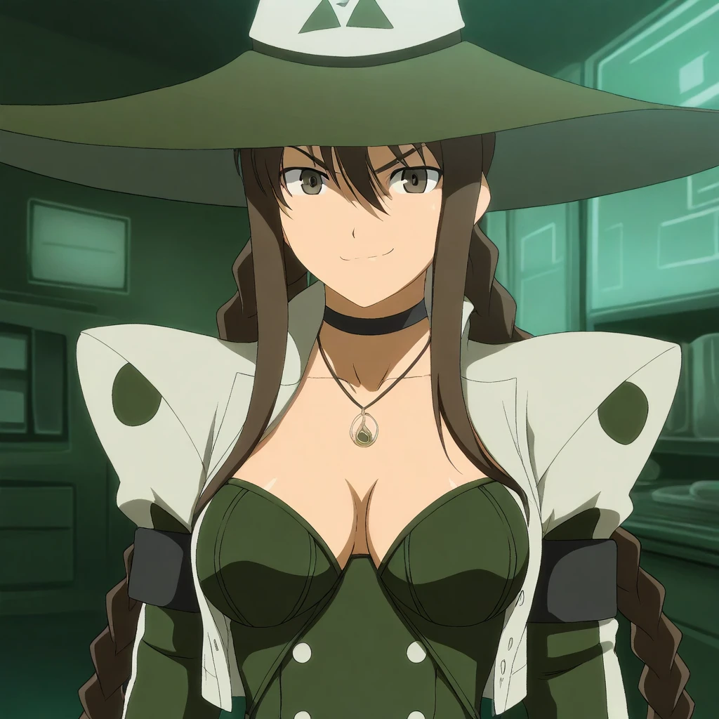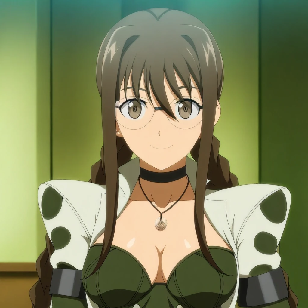 white jacket, dark-green sleeves, long sleeves, black armbands, dark-green bustier, buttons, cleavage, choker, necklace, pendant, belt, belt buckle, dark-green long-skirt, white trim, black leotard,