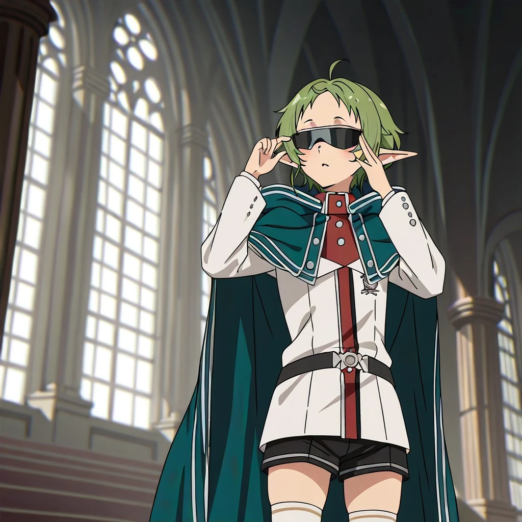 score_9, score_8_up, score_7_up, masterpiece, 1girl, solo, Sylphiette Greyrat, short green hair, pointed ears, red eyes, white jacket, hooded jacket, green cloak, sunglasses, white thighhighs, shorts, standing in a magical library, adjusting eyewear, cinematic lighting, sharp focus, anime style
