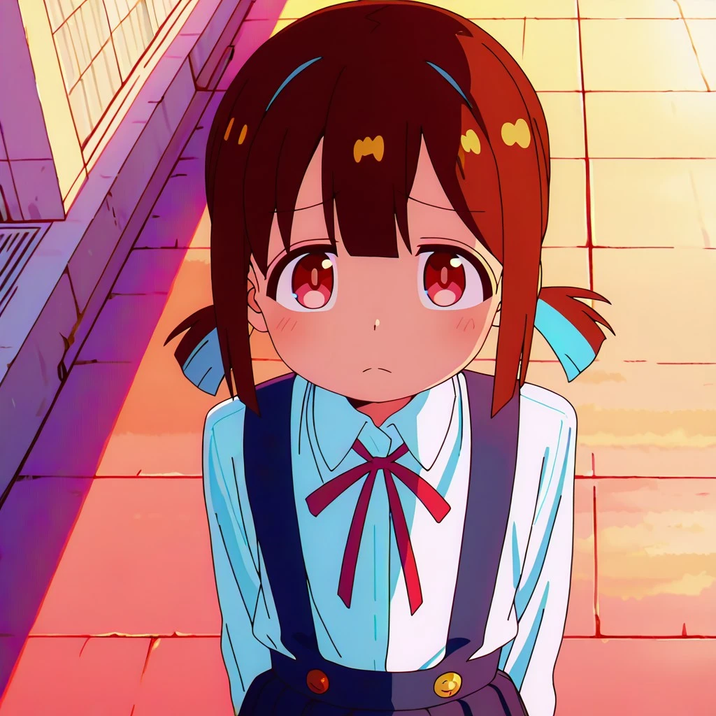 score_9, score_8_up, score_7_up, masterpiece, 1girl, solo, Momiji Hozuki \(ONIMAI\), short brown hair, short twintails, red eyes, eyebrows visible through hair, school uniform, white shirt, neck ribbon, black suspender skirt, standing on the school rooftop, looking at viewer, blushing, slight frown, cinematic lighting, sharp focus, anime style