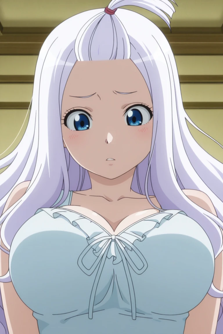 1girl, solo, Mirajane strauss, white hair, long hair, blue eyes, hair ornament, big ,official_style, anime_coloring, anime screencap
