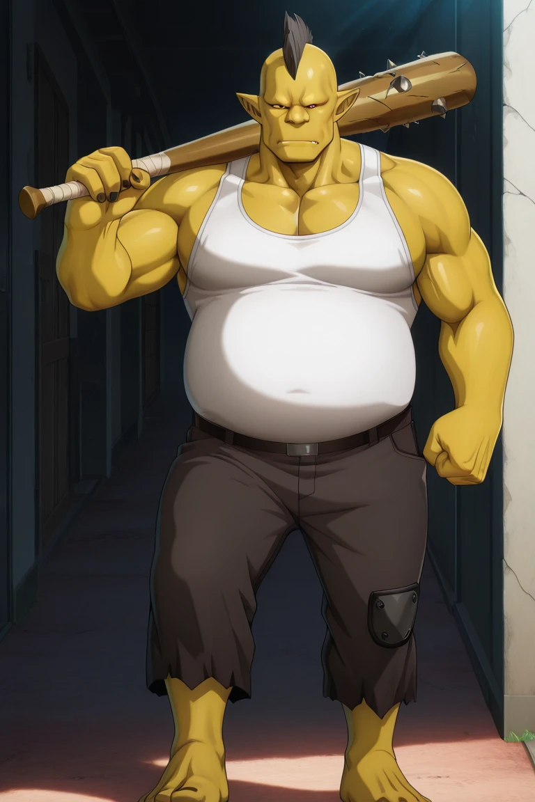 1boy, monster, solo, Orc_thug, tank_top, fat, baseball_bat, barefoot, white_tank_top, muscular, fat_man, pants, holding, bald, nail, colored_skin, over_shoulder, bara, weapon, yellow_skin, pectorals, mohawk, muscular_male, nail_bat