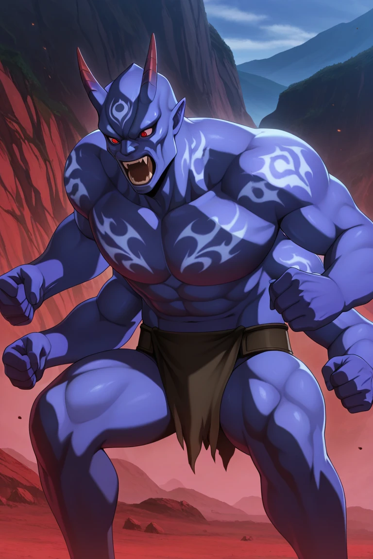 1boy, monster, solo, Oni_fighter, muscular, extra_arms, clenched_hands, tattoo, open_mouth, loincloth, blue_skin, demon, red_eyes, purple_skin