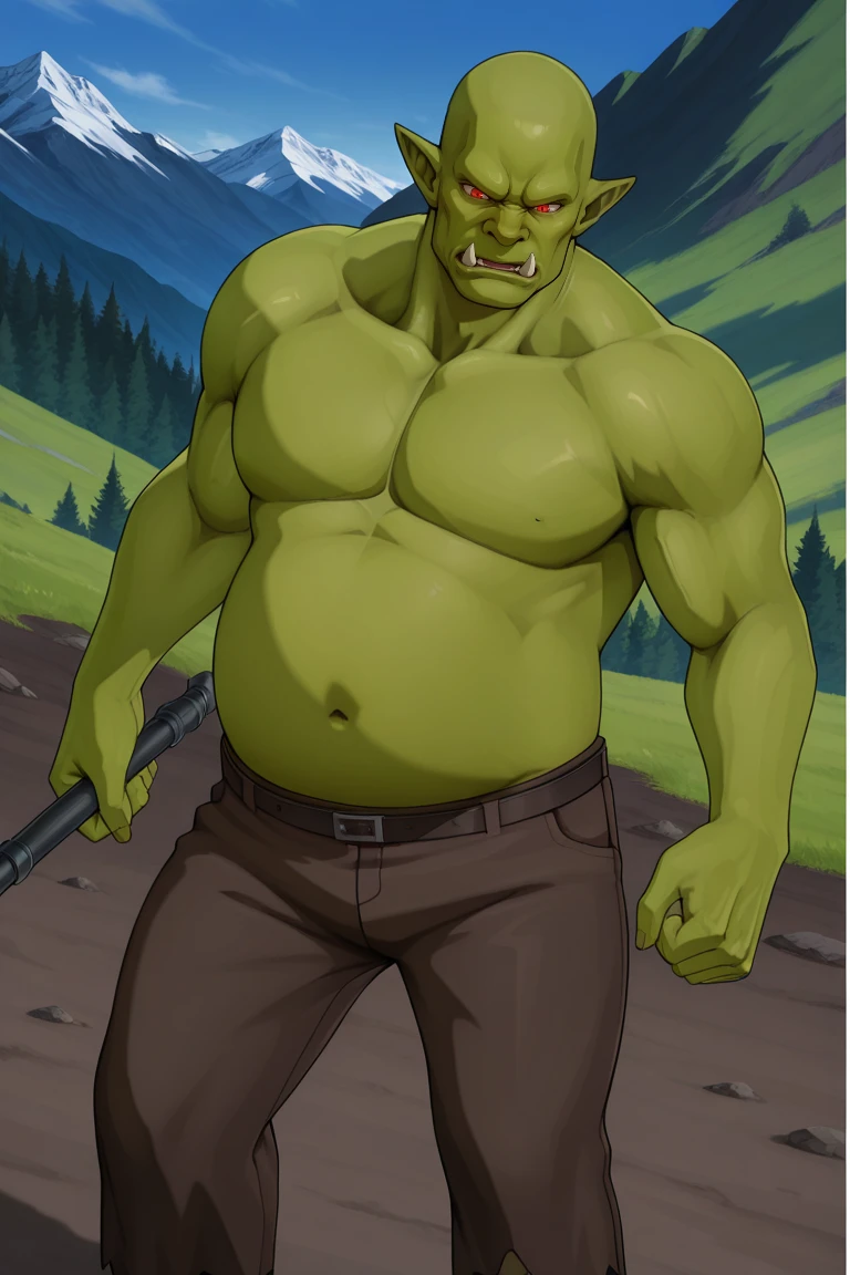 1boy, monster, solo, Orc, green_skin, colored_skin, pointy_ears, red_eyes, bald, navel, muscular, topless_male, pants, open_mouth, fat, tusks