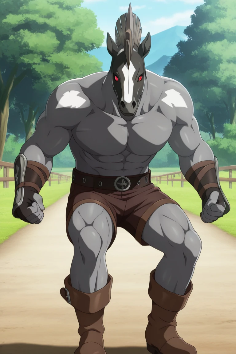 1boy, monster, solo, Horseman_fighter, muscular, horse_head, red_eyes, shorts, muscular_male, clenched_hands, topless_male, grey_skin, brown_footwear, colored_skin, belt, mohawk, brown_shorts,